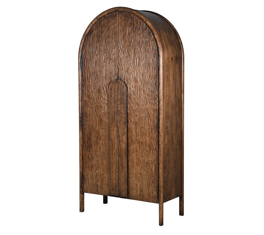 Skriňa poskytuje bohatý úložný priestor na štyroch policových miestach. Uzatvára sa dvojitými dvierkami. Na prvý pohľad vás zaujme originálny tvar. Skriňa má obdĺžnikový pôdorys a je postavená na štyroch štíhlych nožičkách. Ich línia plynule prechádza do rámu konštrukcie, ktorý je vo vrchnej časti ukončený elegantným oblúkom. Oblúkový tvar úložného priestoru kopíruje aj dlhá úchytka na otváranie dvierok a vytvára tak geometrickú kompozíciu inšpirovanú art deco štýlom.