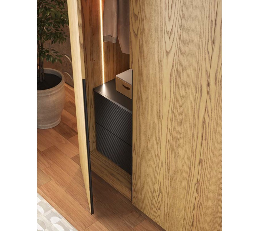 Vnútorné usporiadanie je navrhnuté mimoriadne prakticky a prehľadne. Na pravej strane sa nachádzajú dve vešiakové tyče umiestnené nad sebou, doplnené o hornú policu, čo umožňuje pohodlné zavesenie kratších aj dlhších odevov. Ľavá časť ponúka dve menšie zásuvky s jemným vrúbkovaným povrchom, nad ktorými sa nachádza kratší vešiakový priestor. Zvyšok skrine tvorí systém šiestich otvorených políc, ideálnych na prehľadné uloženie oblečenia, doplnkov či textílií.