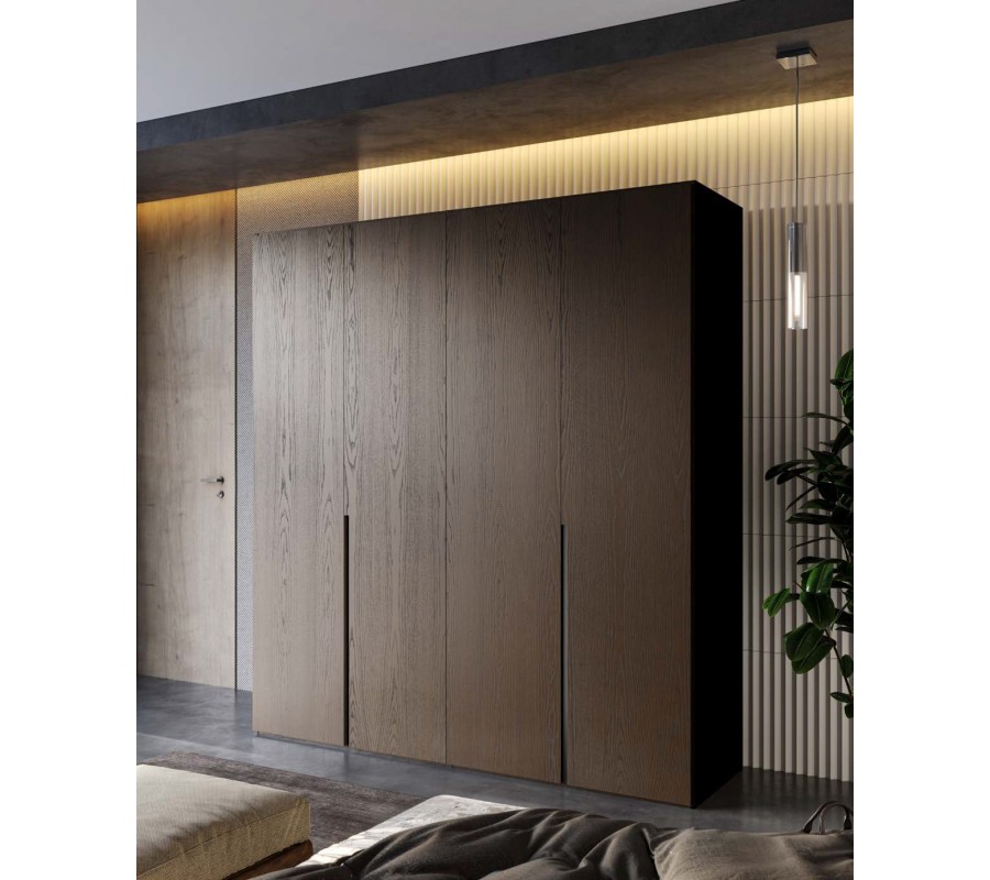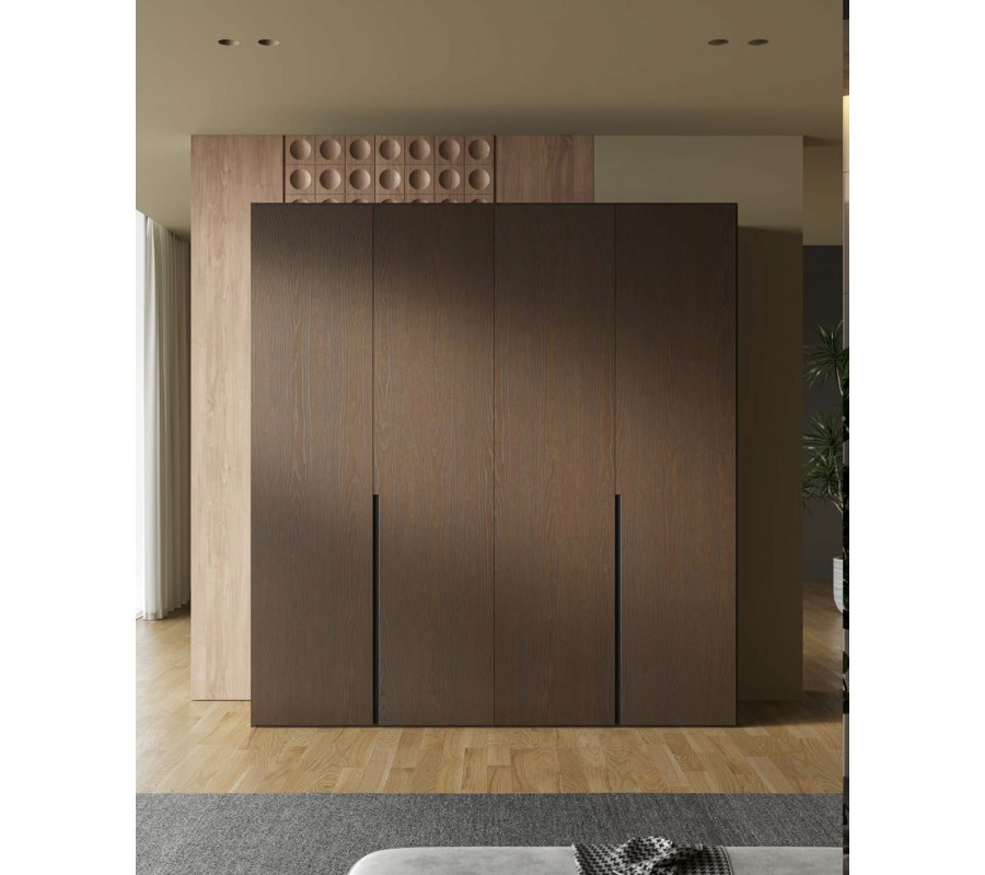 Šatníková skriňa Praga predstavuje výrazný solitér do moderných interiérov, kde vyniká čistými líniami a elegantným spracovaním z masívneho dreva. Obdĺžnikový korpus je doplnený o štyri plné dvere s vertikálnymi vyrezanými úchytkami v spodnej polovici, ktoré pôsobia minimalisticky a zároveň prakticky. Skriňa stojí na nenápadnej podstave bez nožičiek, vďaka čomu pôsobí stabilne a kompaktne.