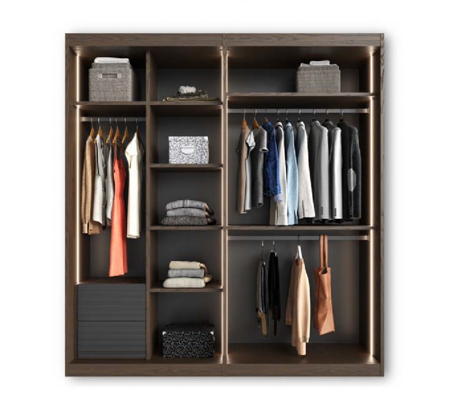 Vnútorné usporiadanie je navrhnuté s dôrazom na prehľadnosť. Na pravej strane sa nachádzajú dve vešiakové tyče nad sebou spolu s hornou policou na sezónne uloženie. Ľavá časť ponúka dve menšie zásuvky s vrúbkovaným povrchom, nad ktorými je menší vešiakový priestor, a zvyšok tvorí sústava šiestich políc na oblečenie či doplnky.