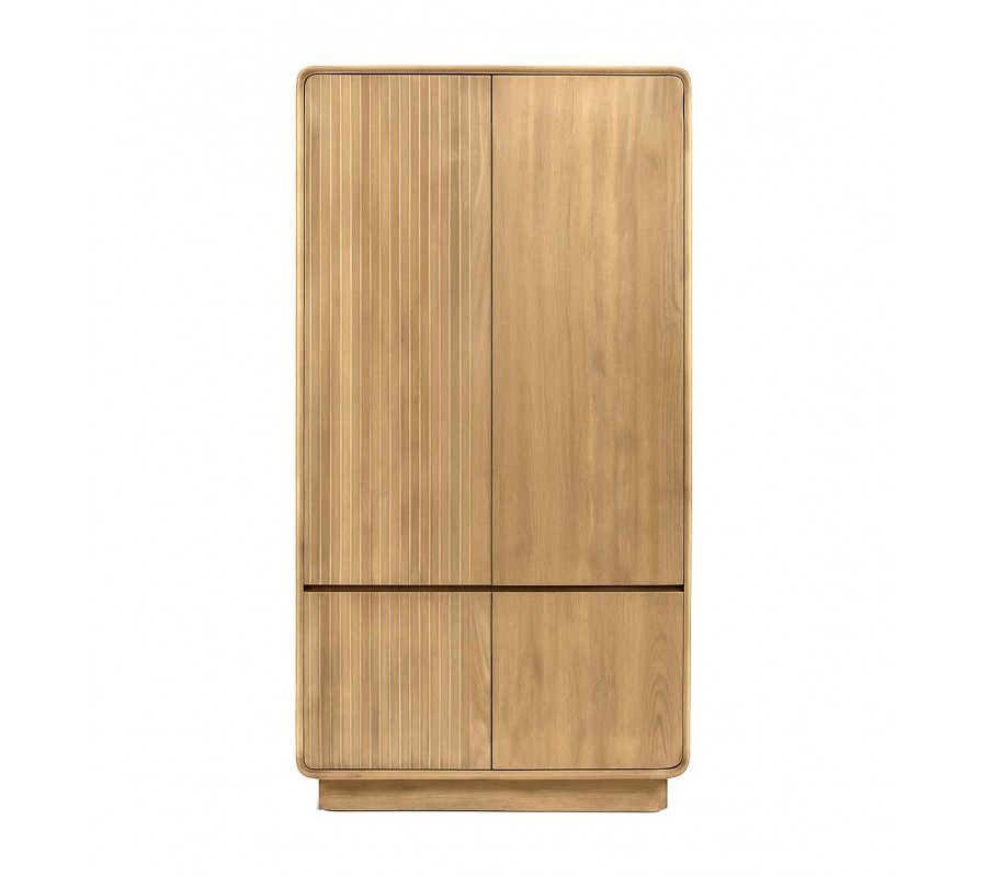 Skriňa má lineárnu siluetu, doplnenú o výrazné zaoblenia rohov, inšpirované retro dizajnom tzv. waterfall nábytku, populárneho v 20. rokoch minulého storočia. Hladké povrchy bez úchytiek a geometrický reliéf v podobe vertikálnych pruhov na jednej polovici pôsobí zasa moderným a mierne asymetrickým dojmom.