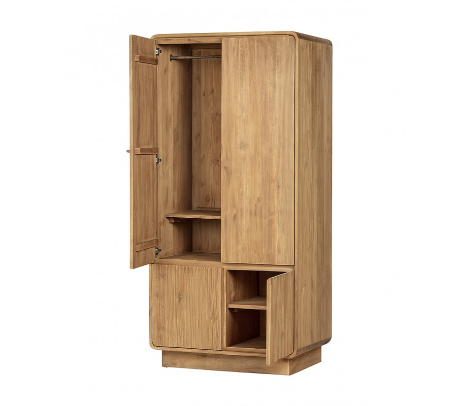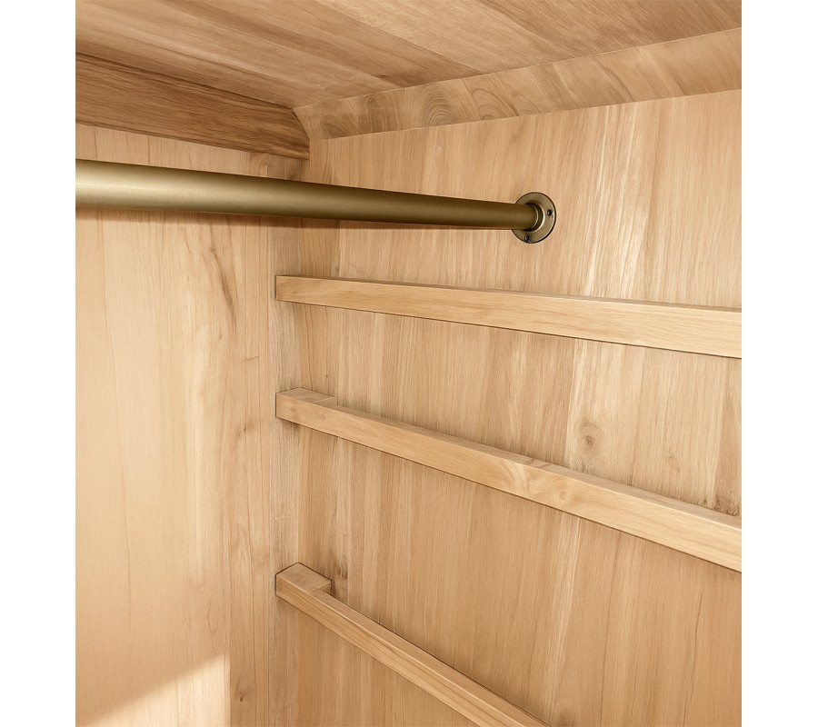 Vrchná dvojdverová časť je vyššia a obsahuje kovový tyč v zlatej farbe za zavesenie vešiakov. V spodnej tretine sa nachádza polica a súčasťou balenia je aj organizér na doplnky so šiestimi priečinkami. Spodná dvojdverová skrinka je nižšia. Na ľavej strane sa nachádza policové miesto v plnej výške, vhodné napríklad na obuv či úložný box. Pravá strana je v strede predelená policou a poskytuje dva nižšie úložné priestory.