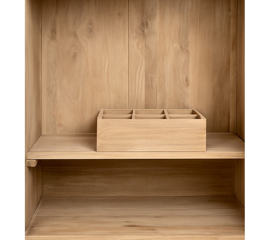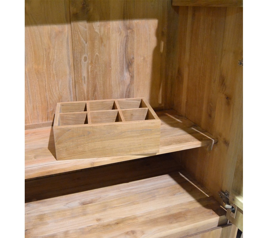 Skriňa je vyrobená z masívneho teakového dreva, ktoré jej v kombinácii s remeselným ručným opracovaním dodáva luxusný charakter. Naturálna svetlá hnedá farba s jemnou štruktúrou letokruhov pôsobí teplým prírodným dojmom. Teak je tiež mimoriadne pevný a odolný, čo zaručí nábytku dlhoročnú trvanlivosť.