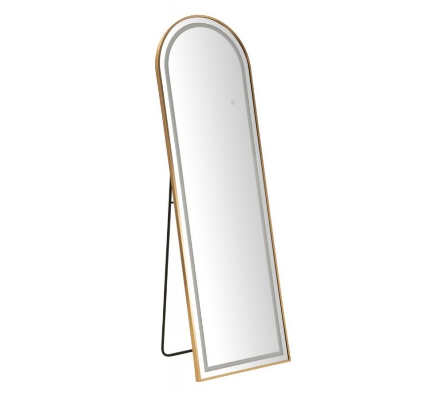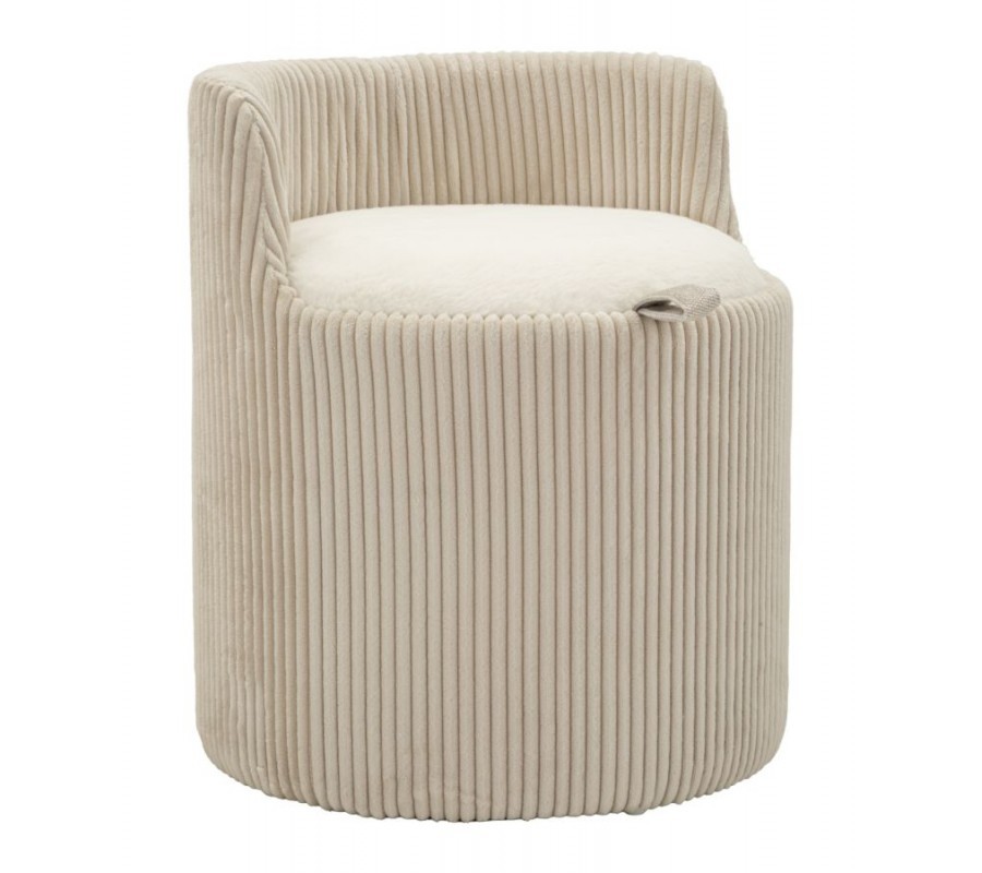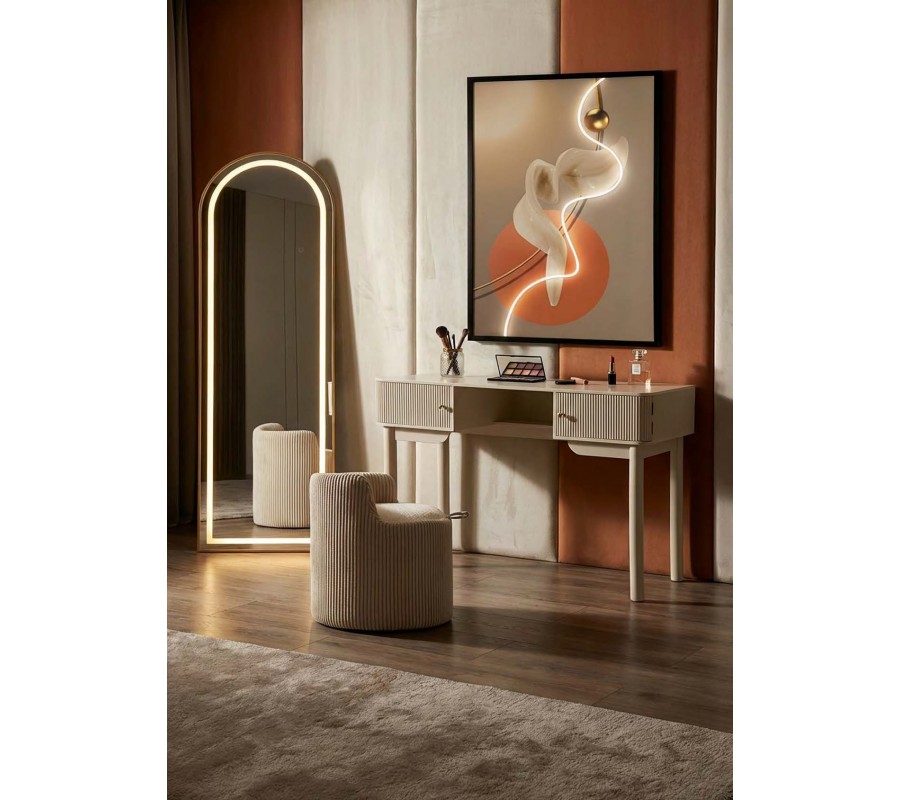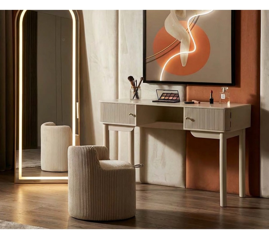 Zostava je zložená z toaletného stolíka v svetlom béžovom prevedení, ktorý dopĺňa okrúhla taburetka s nízkou opierkou na chrbát. Vizuálne ich prepája zvislý rebrovaný dizajn, typický pre art deco štýl. V podobe vyrezávaného reliéfu sa nachádza na prednej a bočných stranách stolíka a ako prešívanie zdobí obvod taburetky. Plyšový poťah v krémovej farbe ladí s lakovaním stolíka a zároveň prináša do priestoru štrukturálny kontrast. Vysoké zrkadlo s LED osvetlením v zlatom kovovom ráme bude korešpondovať s úchytkami na stolíku a jeho klenutá vrchná časť zdôrazňuje geometrickú eleganciu. Úložný priestor na kozmetiku či šperky poskytnú dve skrinky a polica na stolíku, zatiaľ čo do interiéru taburetky vojdú aj väčšie textílie, vankúše či deky.