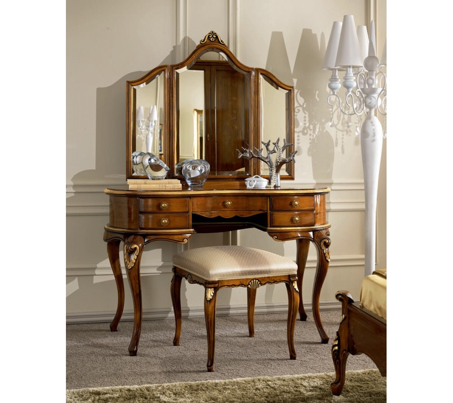 Luxusný toaletný stolík z jedinečnej kolekcie talianskeho nábytku Pasiones je kúskom vhodným pre všetkých milovníkov klasického a rustikálneho štýlu. Vyznačuje sa svojím elegantným prevedením z masívneho dreva a zaujímavým oválnym tvarom, pričom povrchová úprava je obohatená o precízne ručné vyrezávanie a vkusné ornamentálne zdobenie. Toaletný stolík disponuje piatimi zásuvkami s okrúhlymi kovovými rukoväťami. Na výber ponúkame viacero možných farebných prevedení dreva aj kovových úchytov, vďaka čomu máte možnosť vytvoriť si skutočne jedinečný a originálny kúsok vhodný do vášho interiéru. Odporúčame toaletný stolík Pasiones kombinovať s masívnym nábytkom a čalúnenou taburetkou či kreslom. Nábytok z tejto kolekcie vynikne najmú v rustikálne a klasicky ladených interiéroch.