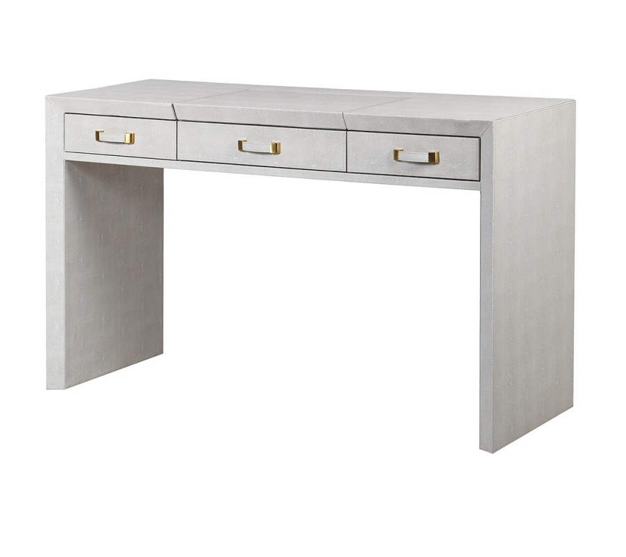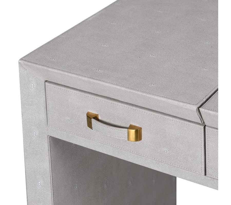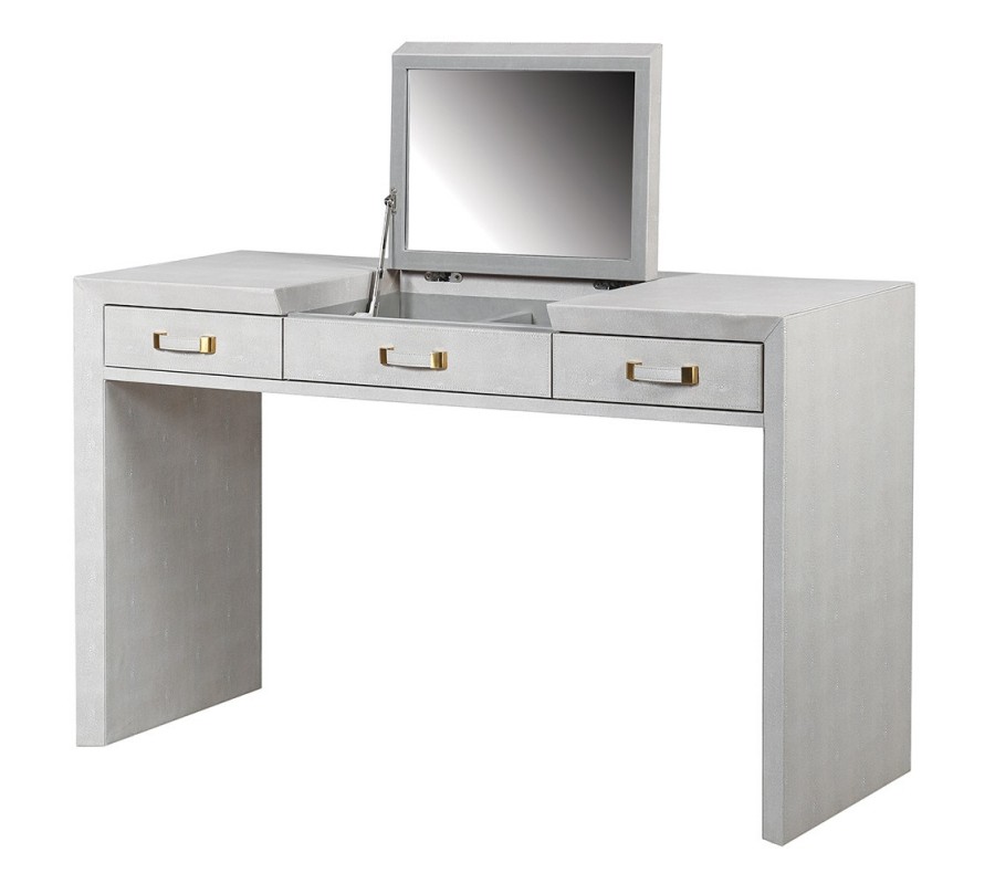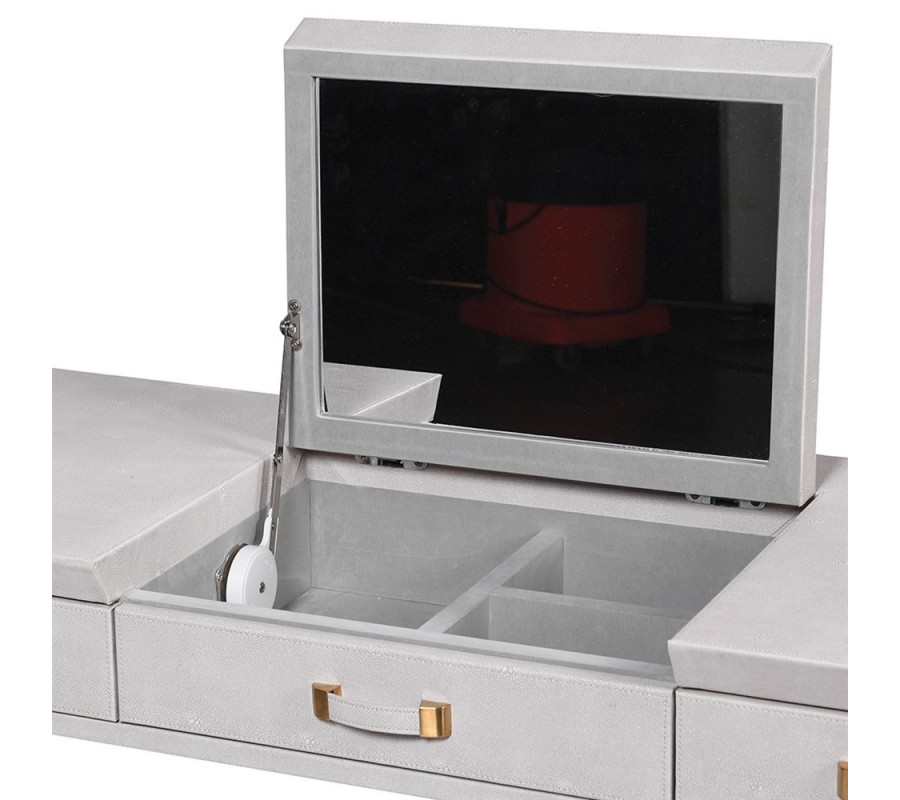 Moderný toaletný stolík Ivoria na nožičkách v šagrénovom koženom sivom prevedení so zásuvkami a skrytým zrkadlom 120cm
