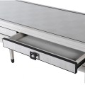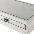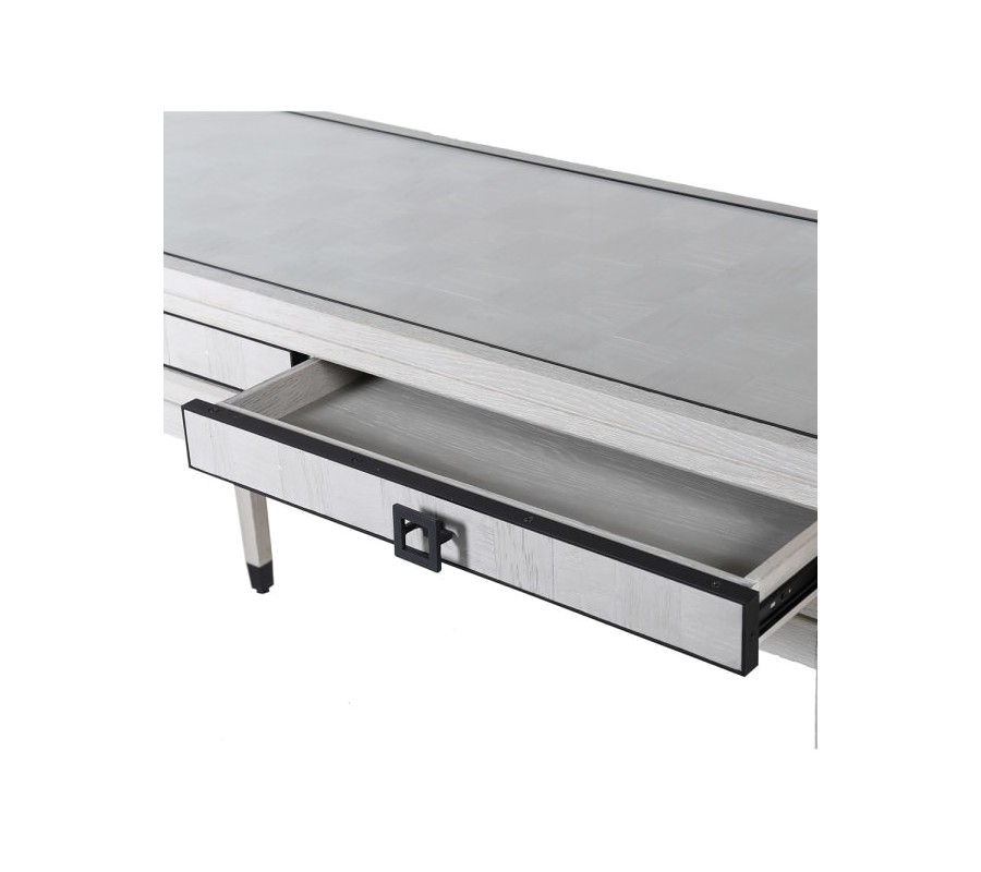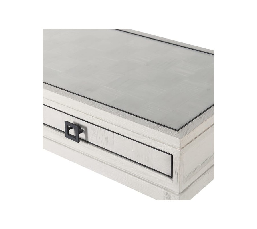 Dizajnový toaletný stolík z našej kolekcie Quadria Blanca sa vyznačuje svojím elegantným vzhľadom tvoreným jednoduchými geometrickými tvarmi a čistými líniami. Vo svojom dizajne prepája prvky moderného štýlu s funkčným prevedením, vďaka čomu sa stáva pútavým a nadčasovým kúskom vhodným na doplnenie moderných spální, beauty salónov či iných priestorov. Vďaka svojmu univerzálnemu prevedeniu je možné stolík Quadria Blanca všestranne využiť a prispôsobiť vašim potrebám. Stôl je vyrobený z masívneho dubového dreva a nesie sa v štýlovom off white bielom prevedení. Povrchová úprava je zároveň obohatená zaujímavým štvorcovým vzorom tvoreným precíznym ukladaním jednotlivých kúskov dreva s rôznymi smermi letokruhov. Elegantné biele telo dopĺňajú dizajnové čierne kovové prvky v podobe rámovania na zásuvkách, geometrických úchytov a ozdobných prvkov na nožičkách. Dve praktické zásuvky vás potešia svojím priestranným úložným priestorom vhodným na uskladnenie toaletných potrieb či iných predmetov podľa umiestnenia stola. Moderný vzhľad dosiahnutý farebnou a materiálovou kombináciou vaše priestory spestrí a rozžiari! Toaletný stolík Quadria Blanca odporúčame kombinovať aj s ďalšími kúskami z tejto kolekcie, modernými doplnkami z kovu a drevenou stoličkou s kovovými nohami.