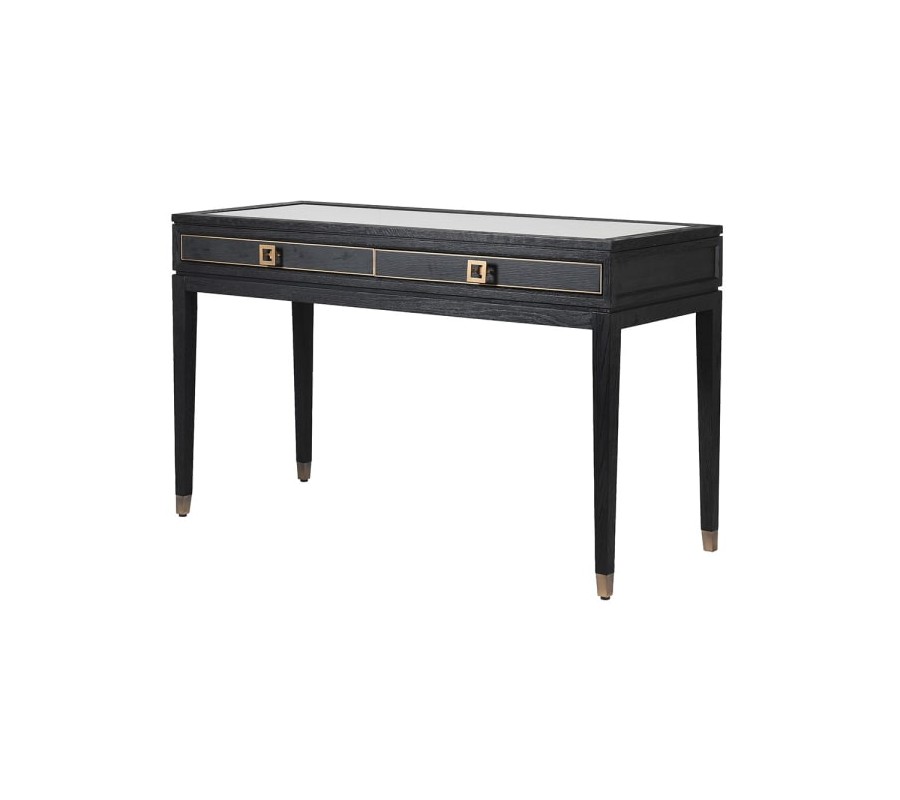 Elegantný toaletný stolík Emperor predstavuje unikátny kúsok, ktorý do priestorov vašej spálne vnesie luxusný art deco nádych. Zaujme svojím nadčasovým vzhľadom, ktorý je tvorený kombináciou univerzálnej farebnosti s jednoduchými geometrickými tvarmi. Stôl pozostáva z konštrukcie z masívneho dubového dreva s čiernou povrchovou úpravou, ktorú na vrchnej doske dopĺňa svetlohnedý ratanový výplet. Vrstva tvrdeného skla zabezpečuje odolnosť a ochranu. Dve praktické zásuvky potešia praktickým úložným priestorom a svojím zdobením v podobe kovovému lemu a geometrických rukovätí v antickej zlatej farbe dodávajú stolíku luxusný nádych. Ozdobné zlaté prvky nájdete aj na spodnej časti zúžených nožičiek. Toaletný stolík Emperor nádherne zapadne do moderných interiérov zariadených masívnym nábytkom. Zútulní aj priestory beauty salónov či hotelových izieb ladených v luxusnom modernom štýle. Pre zjednotenie priestoru a dotvorenie exkluzívneho vzhľadu odporúčame tiež kombináciu s ďalšími kúskami z našej kolekcie Emperor a s doplnkami v zlatej farbe!