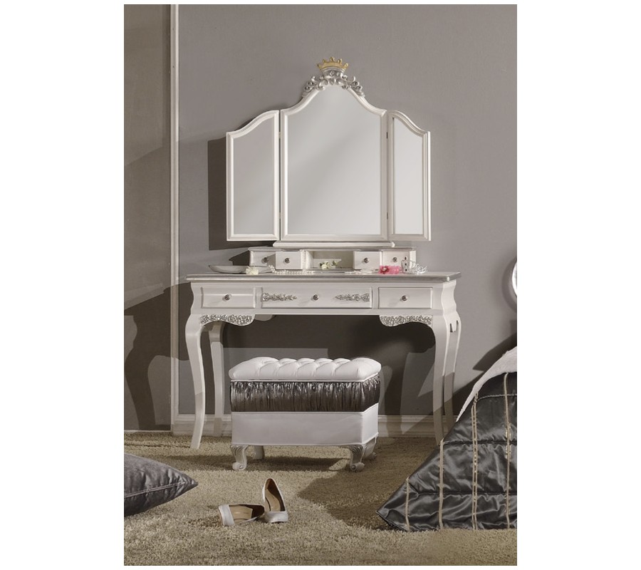 Luxusný toaletný stolík Alegro predstavuje unikátne prepojenie kvality, estetického vzhľadu a funkčnosti. Jeho telo z masívneho dreva je zdobené nádherným precíznym vyrezávaním, ktoré mu dodáva unikátny charakteristický vzhľad. Hladký povrch v kombinácii s vyrezávaným zdobením vytvára klasický vzhľad s jemným barokovým nádychom, ktorý umocňujú ozdobné strieborné aplikácie na prednej časti stolíka. Farebné prevedenie toaletného stolíka Alegro si môžete vybrať spomedzi niekoľkých ponúkaných odtieňoch, ktoré nájdete v priloženom vzorkovníku. To umožňuje vynikajúce kombinovanie tohto kúsku s ďalším zariadením vašej spálne. Tri praktické zásuvky poskytnú úložný priestor na všetky toaletné a kozmetické predmety. Krásne zaoblené nožičky i spodné hrany zásuviek dávajú stolíku nezameniteľný nádych klasického štýlu, ktorý pozdvihne váš interiér a dodá mu luxusný vzhľad. K stolíku odporúčame doplniť aj rovnomenné zrkadlo či praktickú taburetku Alegro.