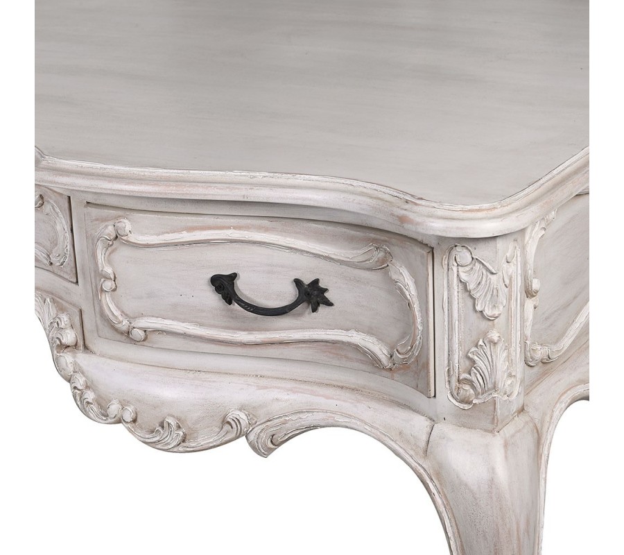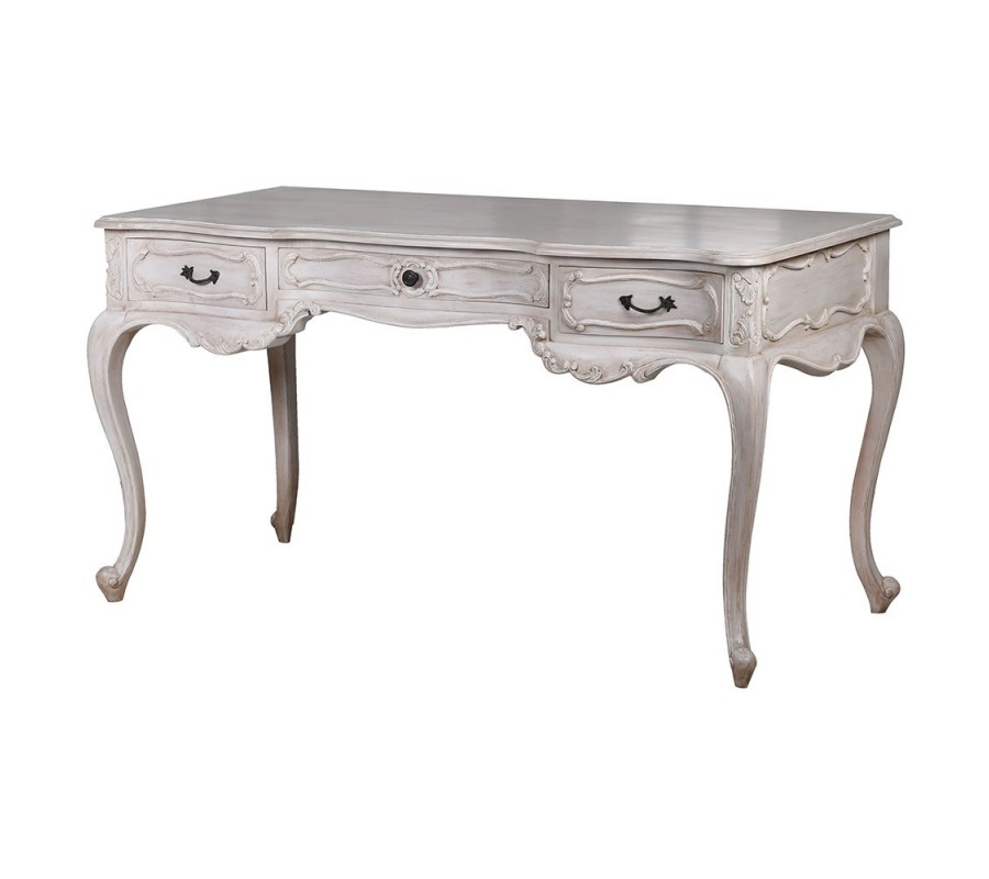 Originálnymi detailmi sú jeho vyrezávané listové motívy po celom obvode, inšpirované francúzskym rokokom. Písaciu dosku lemuje jemná rímsa v rustikálnom štýle. Disponuje troma priestrannými zásuvkami obohatenými o čierne kovové úchytky, ktoré vytvárajú príjemný kontrast a tvarovo dokonale ladia k celkovej estetike stolíka.