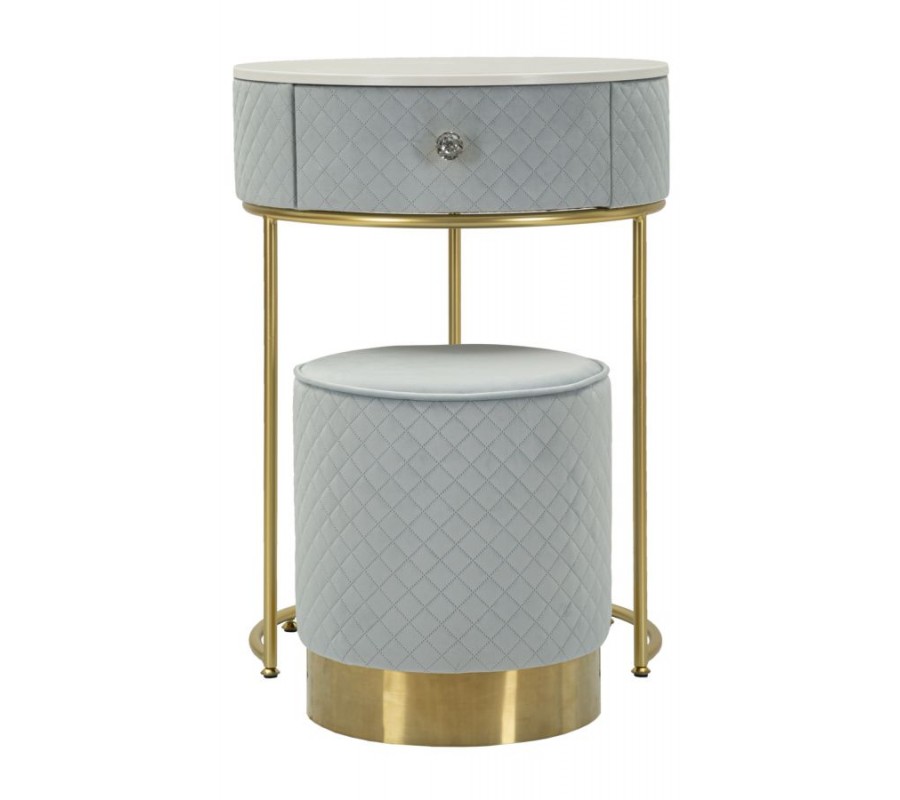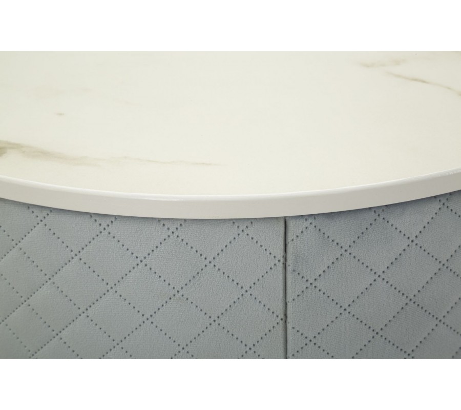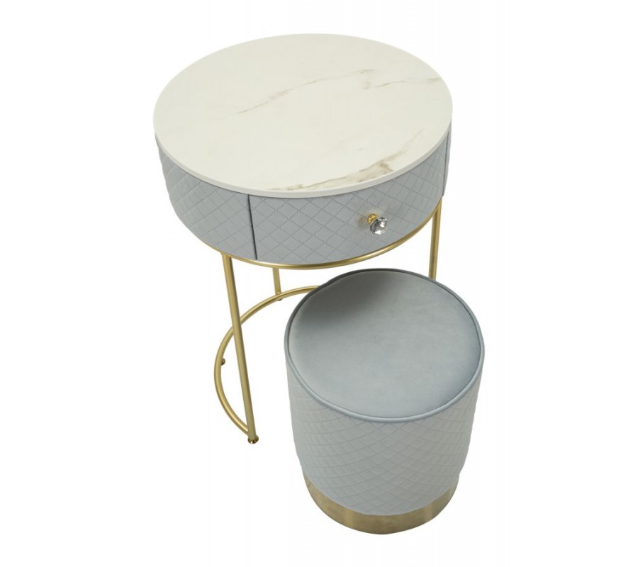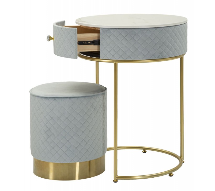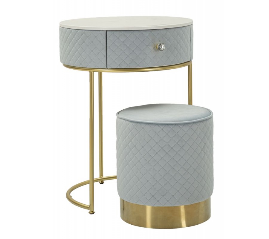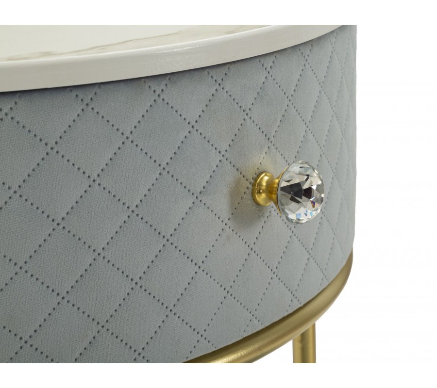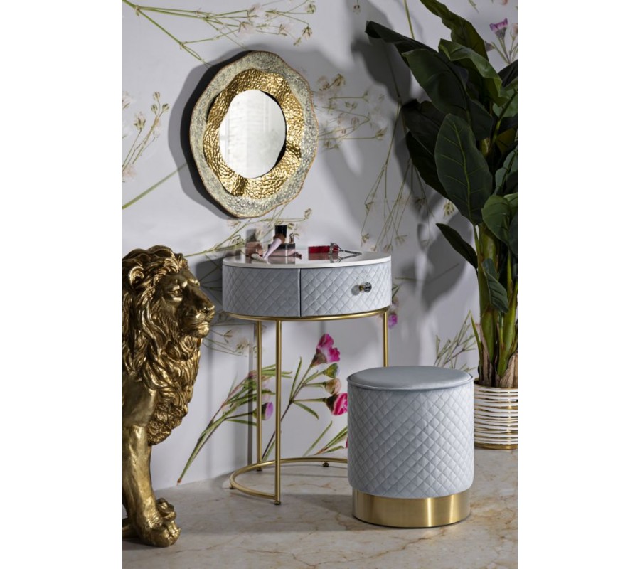 Toaletný stolík má okrúhly tvar s výškou 70 cm a priemerom 52 cm a jeho vrchnú dosku zdobí exkluzívny dizajn bieleho mramoru s jemným sivým žilkovaním. Jeho svetlá farba krásne korešponduje s modrým zamatovým poťahom, ktorý pokrýva obvod stolíka. Geometrické prešívanie s diamantovým vzorom prináša zaujímavú štruktúru a podčiarkuje luxusný vzhľad. Pod vrchnou doskou je umiestnená zásuvka, ktorá sa otvára pomocou sklenenej úchytky s honosným brúseným kryštálovým vzhľadom.
