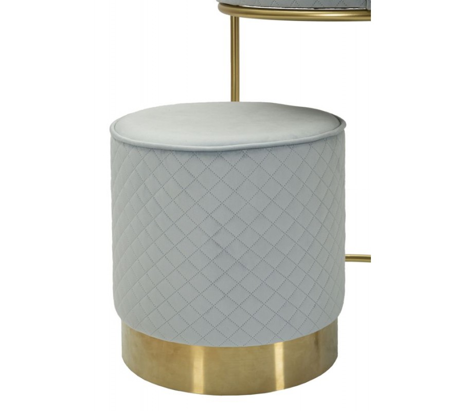 Taburetka je okrúhla, s výškou 39 cm a priemerom 36 cm, bez opierok. Má plnú kovový podstavu v rovnakej zlatej farbe, ako stolík. Pohodlné sedenie zaručí penové čalúnenie a rovnaký nebovo modrý zamatový poťah, ako sa nachádza aj na stolíku. Obvod taburetky tiež zdobí diamantové prešívanie, zatiaľ čo sedacia časť je hladká.
