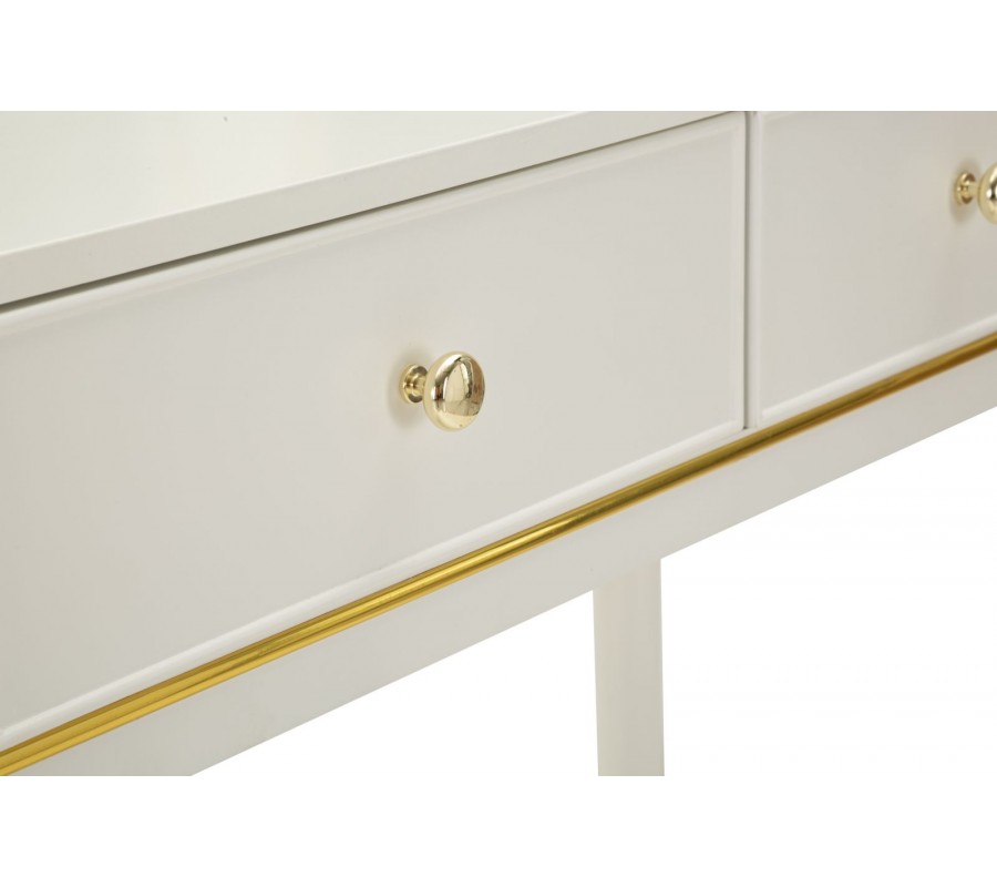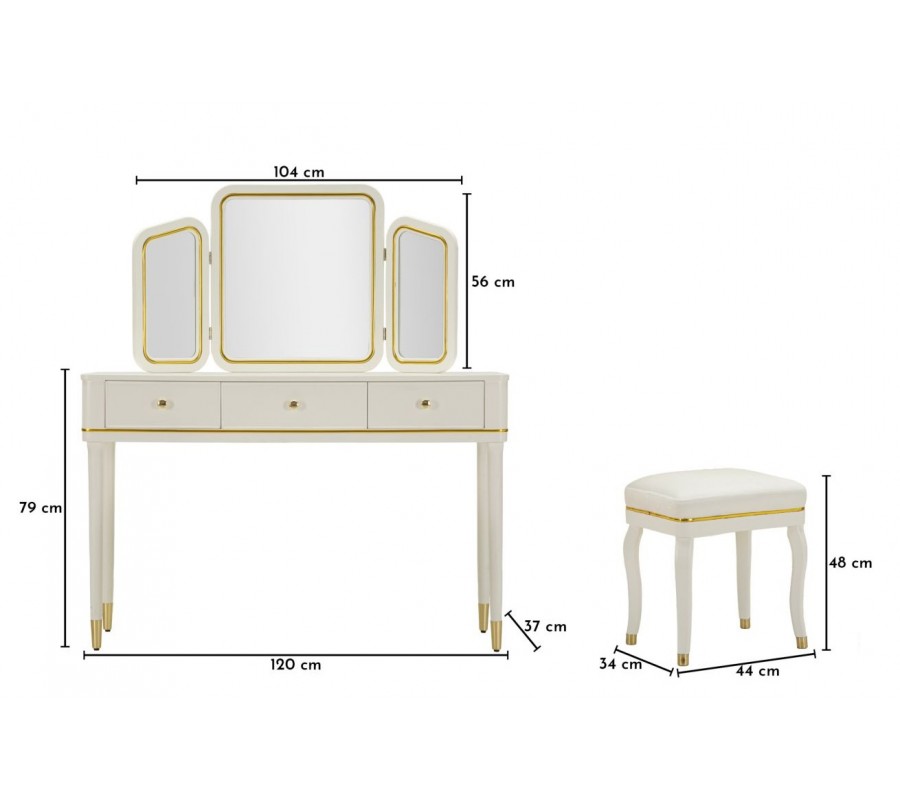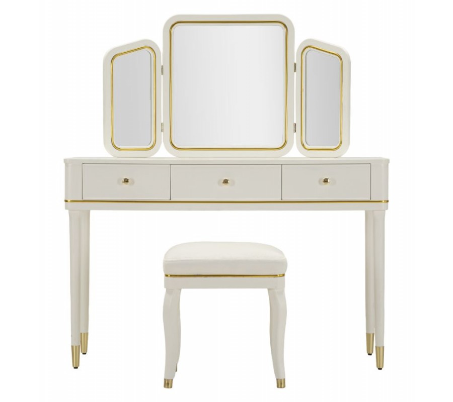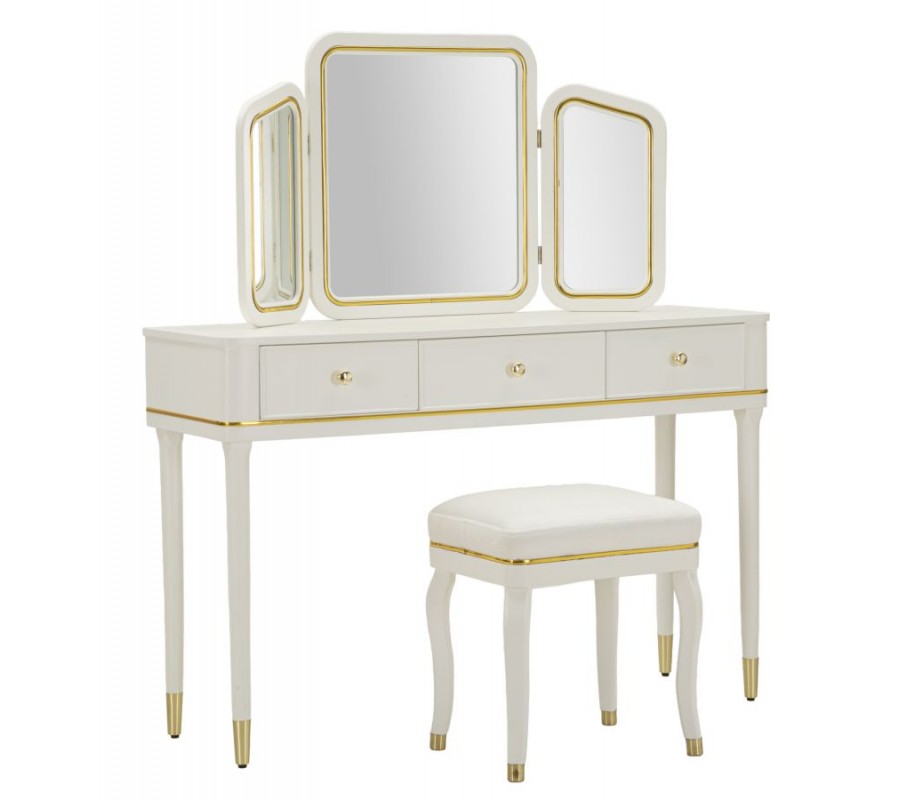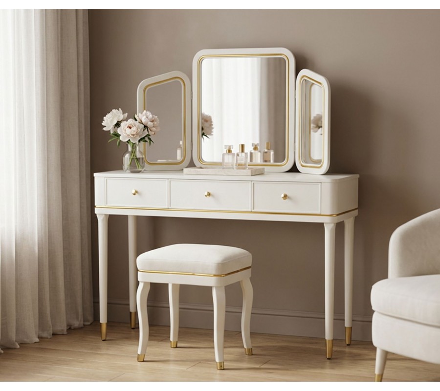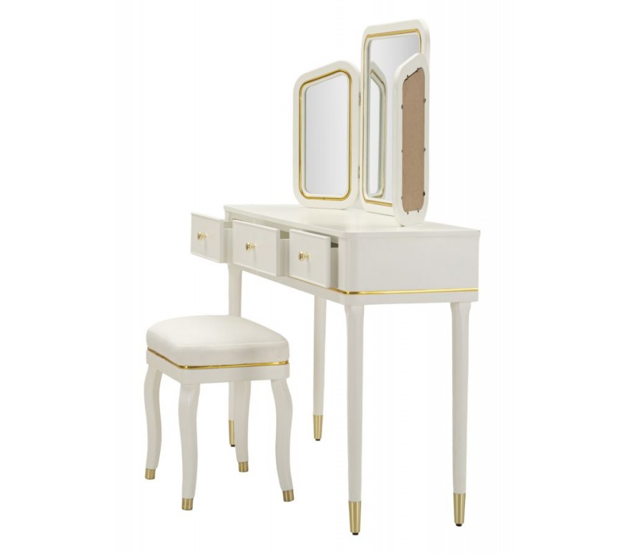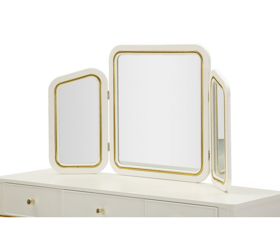 Stolík je vybavený tromi zrkadlami – jedným centrálnym veľkým a dvoma menšími bočnými, ktoré je možné natáčať podľa potreby, čo zabezpečuje komfort pri líčení a úprave vlasov z rôznych uhlov. Zrkadlá majú tenký kovový rám v zlatej farbe, ktorý elegantne ladí s celkovým dizajnom stolíka. Biely korpus je jemne lemovaný zlatými kovovými detailmi po bokoch, okolo zásuviek aj po obvode, čím pôsobí dekoratívne, no stále vkusne a vyvážene.