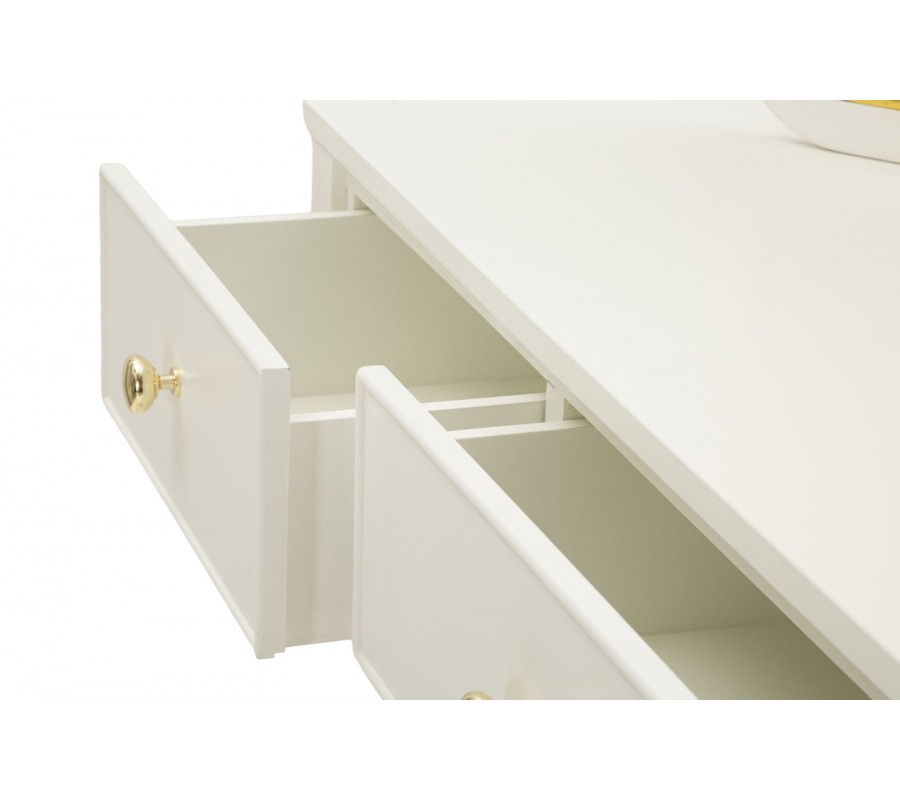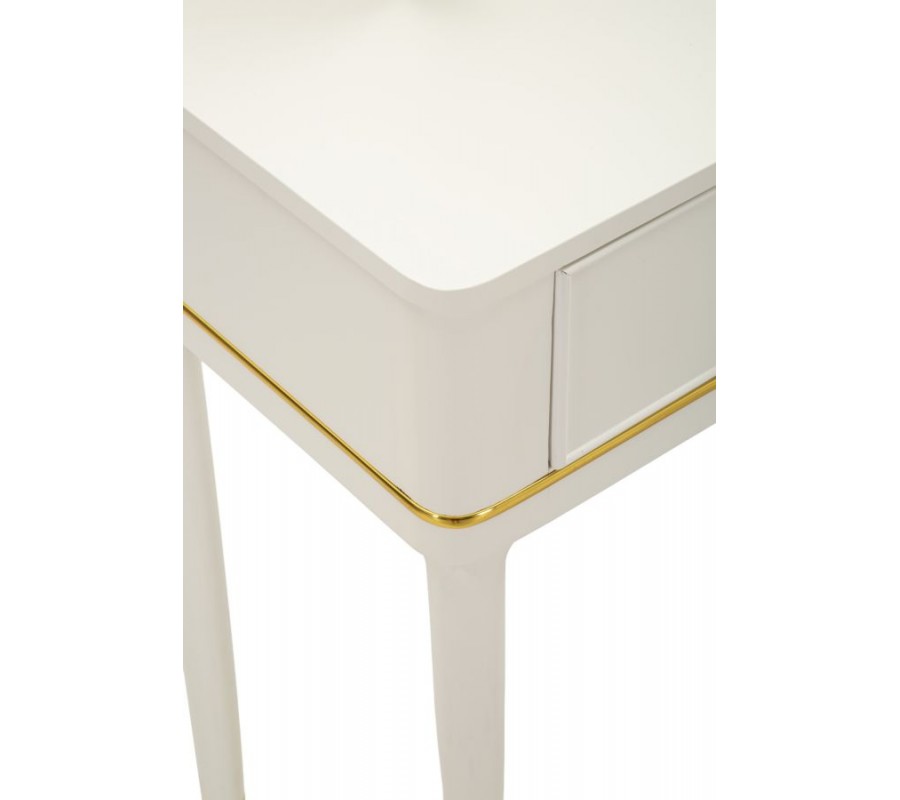 Tri praktické zásuvky poskytujú dostatok úložného priestoru na kozmetiku, šperky a doplnky. Zásuvky sú doplnené malými okrúhlymi kovovými úchytkami v zlatej farbe, ktoré podčiarkujú luxusný charakter nábytku. Elegantné kabriolové nožičky v jemnom zakrivení dodávajú stolíku ľahkosť a klasický šarm, pričom ich zakončenie v zlatom kove vytvára sofistikovaný detail.