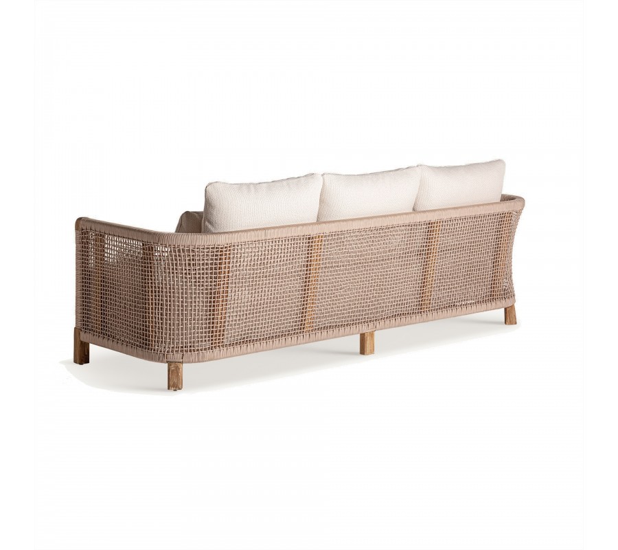 Luxusná etno trojmiestna béžová záhradná sedačka Miliana s masívnym hnedým rámom a textilným výpletom s vankúšmi 240 cm