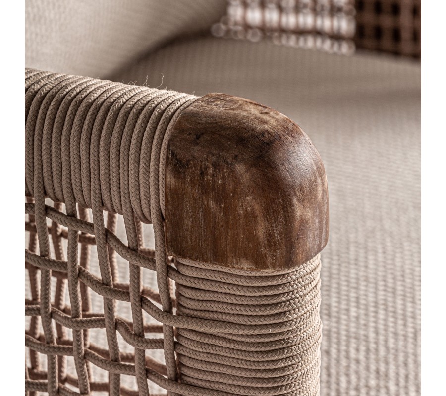 Opierky na ruky sú tvorené pevnou drevenou konštrukciou, ktorá je vyplnená výpletom z recyklovaného polypropylénu. Tento ručne prepracovaný výplet je vzdušný, flexibilný a zároveň dostatočne pevný, čím poskytuje pohodlnú oporu. Vertikálne drevené výstuhy v ráme dodávajú opierkam vyššiu pevnosť a odolnosť. Výplet v prírodnom odtieni krásne ladí s celkovým dreveným rámom a dopĺňa jemné čalúnenie.