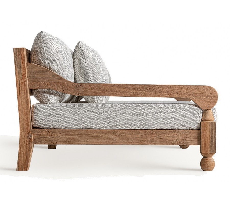 Masívna konštrukcia je vyrobená z naplaveného dreva v hnedej farbe, ktoré nie je lakované, čím si zachováva svoju prirodzenú štruktúru letokruhov a autentický vzhľad. Predné nožičky sú guľaté, čo pridáva na klasickom koloniálnom šarme. Opierky na ruky majú atypický vyrezávaný tvar, ktorý dodáva sedačke jedinečný charakter. Zadná časť konštrukcie obsahuje dve horizontálne tyče, ktoré zaisťujú pevnosť a stabilitu.