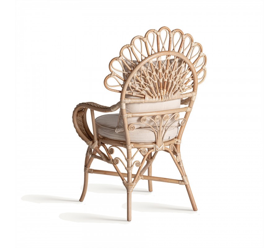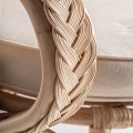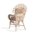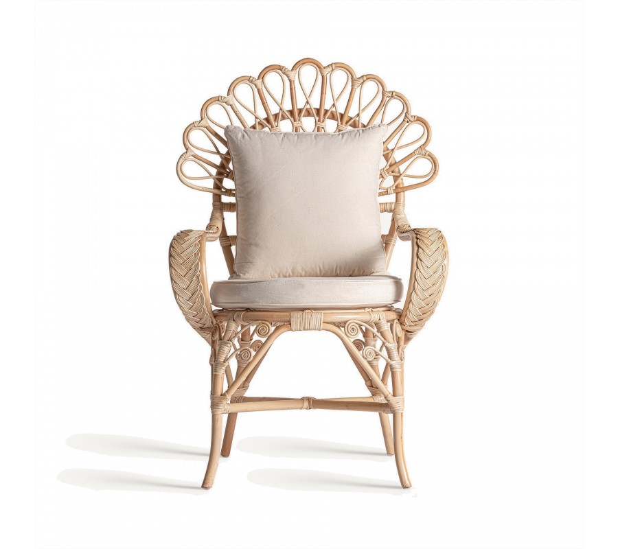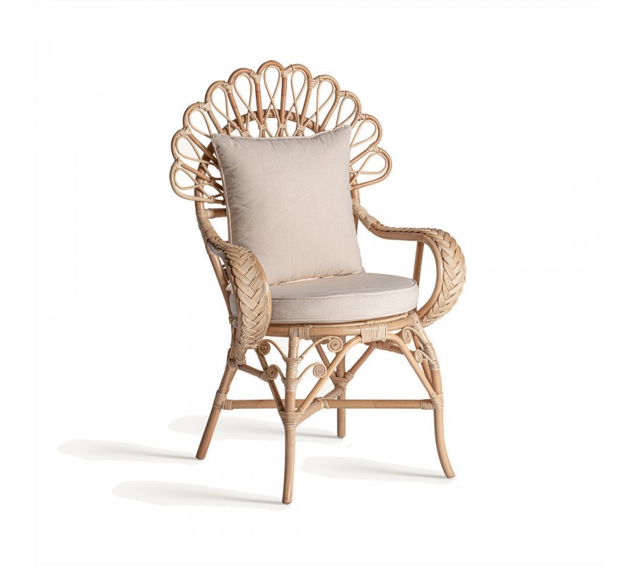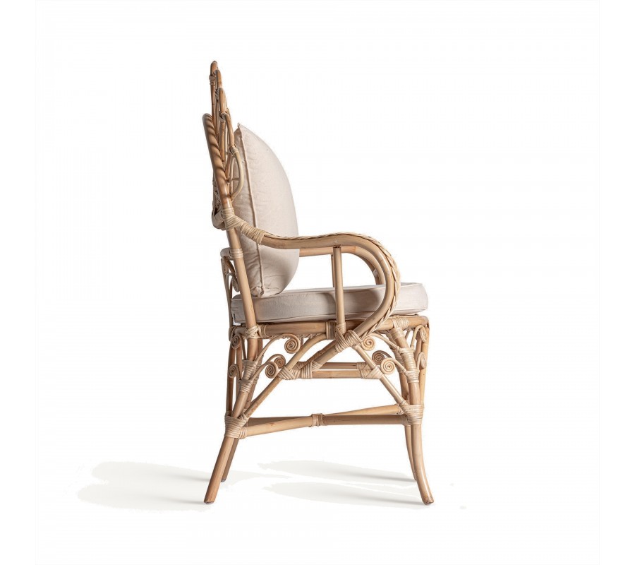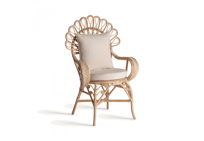 Záhradné kreslo Ganesha bude šperkom vašej terasy. Uchváti vás svojou zdobenou ratanovou konštrukciou s orientálnymi motívmi. Dominujú jej oblé tvary a krivky, počnúc zahnutými prednými nožičkami až po honosnú rozšírenú opierku na hlavu pripomínajúcu majestátny rozprestretý chvost páva. Nožičky sú prepojené krížovou podstavou, ktorá ešte zvyšuje stabilitu nábytku. Po každej strane z nej vychádza oblúk, ktorého vrchol sa pripája k sedacej časti. Pri vrchných častiach nožičiek tak vytvára trojuholníkový priestor vyplnený ozdobnými do špirály stočenými vláknami ratanu. Tento motív pripomína orientálne florálne zdobenie a nájdeme ho aj na spodnej časti chrbtovej opierky. Kreslu dodáva bohatý a honosný vzhľad. Pohodlie vám zaručí okrúhly sedací vankúš a štvorcová hranatá chrbtová opierka so svetlým béžový poťahom, ktorý skvele dopĺňa prírodnú svetlú farbu ratanového dreva. Široké opierky na ruky vypĺňa pletený vrkočový vzor. Kreslom môžete doplniť sedačku v svetlých odtieňoch, pri ktorej bude vďaka svojmu výraznému zdobeniu pôsobiť ako akcentový prvok. Je skvelou voľbou aj do menších priestorov, napríklad na balkón, kde ho stačí doplniť stolíkom. Čalúnenie a široké opierky vám zaručia komfort a kreslo tak bude nie len obľúbeným miestom na oddych, ale tiež aj sofistikovanou a elegantnou dekoráciou.