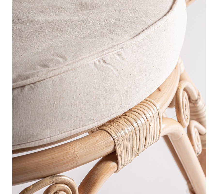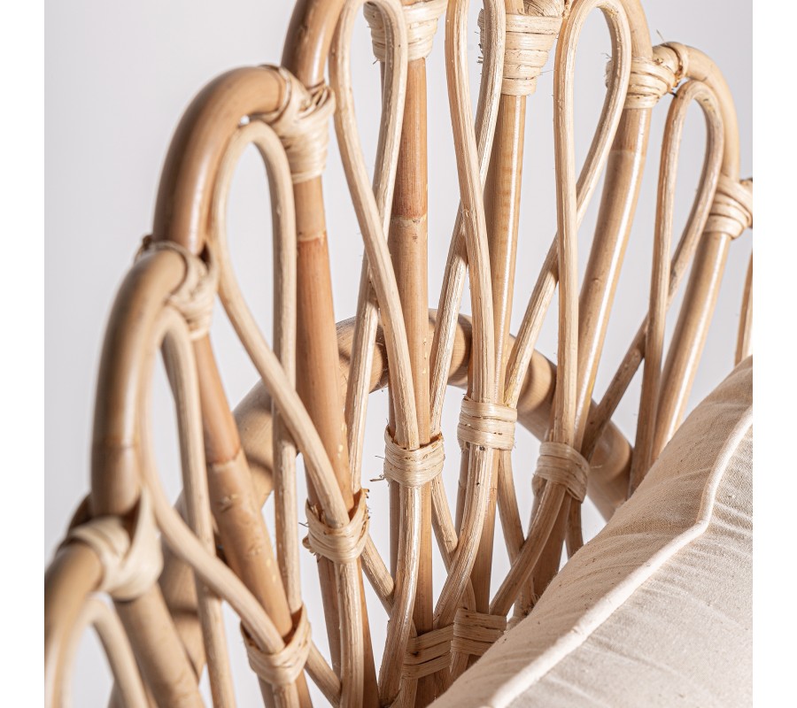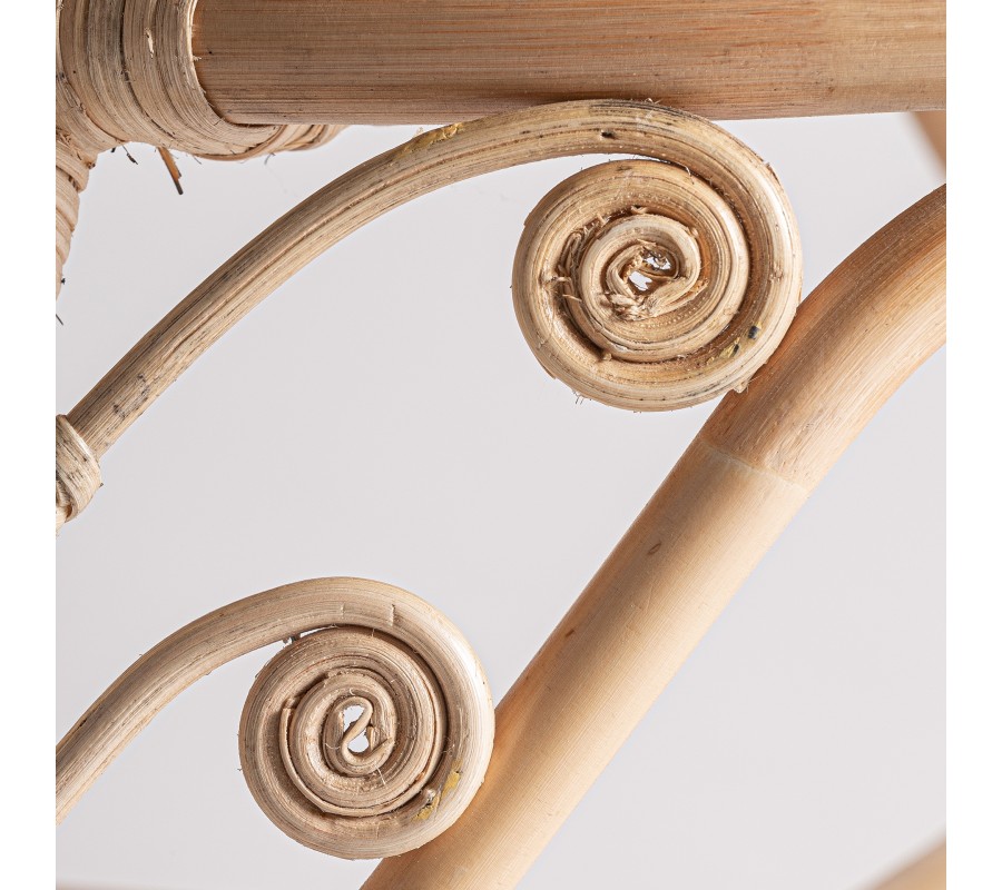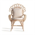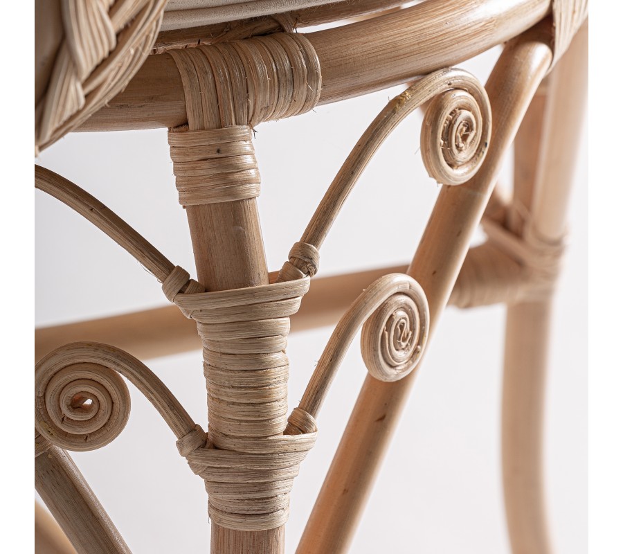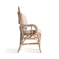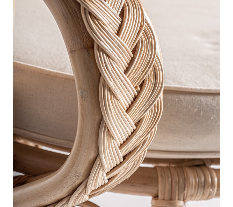 Záhradné kreslo Ganesha bude šperkom vašej terasy. Uchváti vás svojou zdobenou ratanovou konštrukciou s orientálnymi motívmi. Dominujú jej oblé tvary a krivky, počnúc zahnutými prednými nožičkami až po honosnú rozšírenú opierku na hlavu pripomínajúcu majestátny rozprestretý chvost páva. Nožičky sú prepojené krížovou podstavou, ktorá ešte zvyšuje stabilitu nábytku. Po každej strane z nej vychádza oblúk, ktorého vrchol sa pripája k sedacej časti. Pri vrchných častiach nožičiek tak vytvára trojuholníkový priestor vyplnený ozdobnými do špirály stočenými vláknami ratanu. Tento motív pripomína orientálne florálne zdobenie a nájdeme ho aj na spodnej časti chrbtovej opierky. Kreslu dodáva bohatý a honosný vzhľad. Pohodlie vám zaručí okrúhly sedací vankúš a štvorcová hranatá chrbtová opierka so svetlým béžový poťahom, ktorý skvele dopĺňa prírodnú svetlú farbu ratanového dreva. Široké opierky na ruky vypĺňa pletený vrkočový vzor. Kreslom môžete doplniť sedačku v svetlých odtieňoch, pri ktorej bude vďaka svojmu výraznému zdobeniu pôsobiť ako akcentový prvok. Je skvelou voľbou aj do menších priestorov, napríklad na balkón, kde ho stačí doplniť stolíkom. Čalúnenie a široké opierky vám zaručia komfort a kreslo tak bude nie len obľúbeným miestom na oddych, ale tiež aj sofistikovanou a elegantnou dekoráciou.