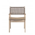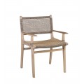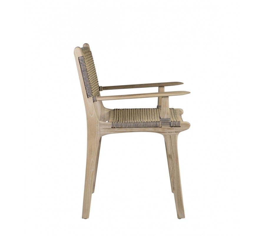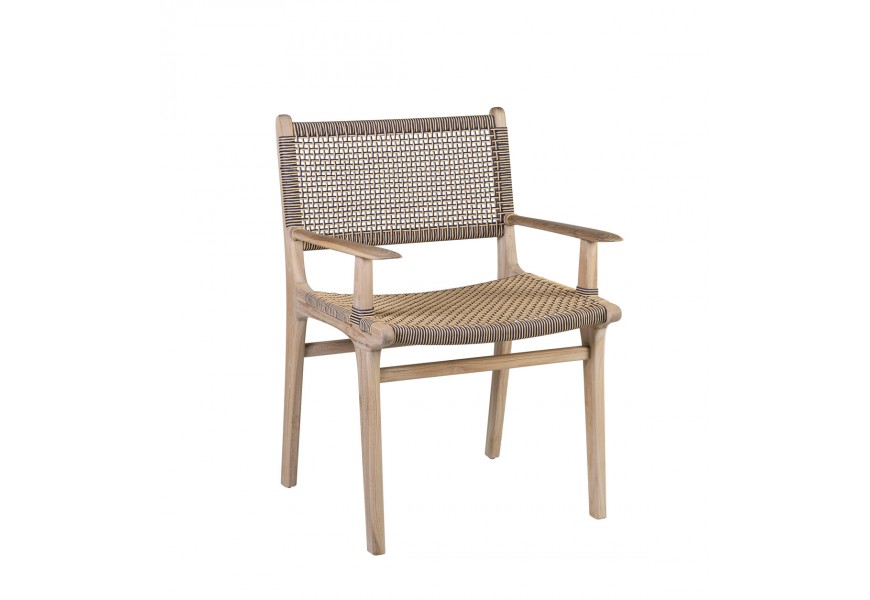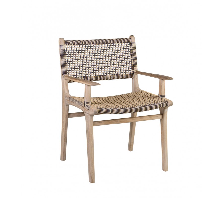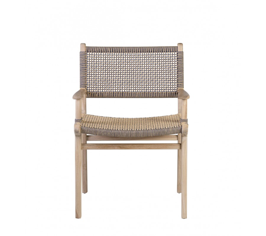 V siluete stoličky dominujú moderné rovné línie. Na prednej a zadnej strane sa medzi nožičkami nachádza spojnica, ktorá zaručuje výbornú stabilitu nábytku a zároveň prináša do dizajnu zaujímavý vizuálny prvok. Sedadlo a opierka majú jednoduchý obdĺžnikový tvar. Na bokoch sa nachádzajú opierky na ruky s plochou vrchnou časťou a zaoblenými koncami. Rovnaké ukončenie majú aj bočné línie chrbtovej opierky a sedacej časti. Rám je vyrobený z teakového dreva.