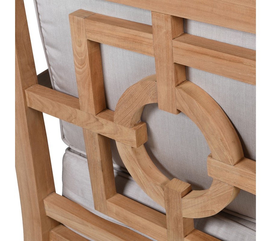 Chrbtová opierka je ozdobená geometrickým vzorom z kruhových a štvorcových motívov. Bočné opierky na ruky sú jemne prehnuté, čo dodáva kreslu elegantný tvar. Pevné drevené nohy sú masívne, čím zaisťujú stabilitu a trvácnosť aj pri dlhodobom používaní vo vonkajších podmienkach.