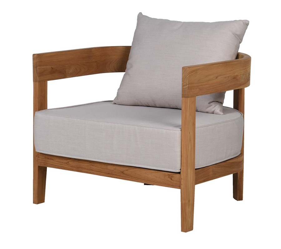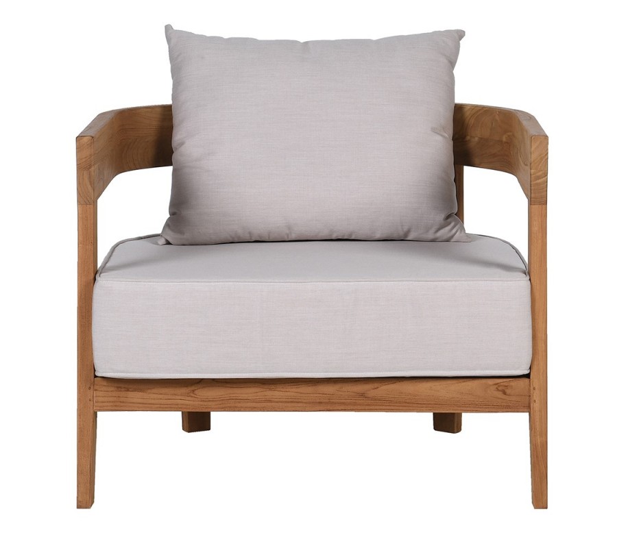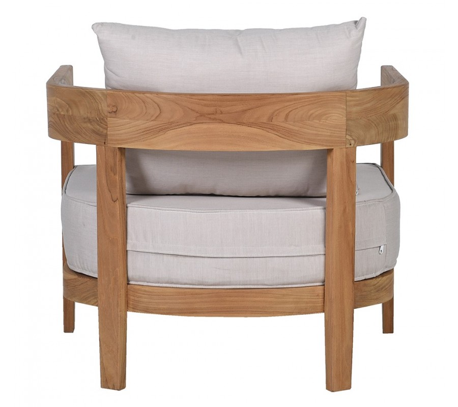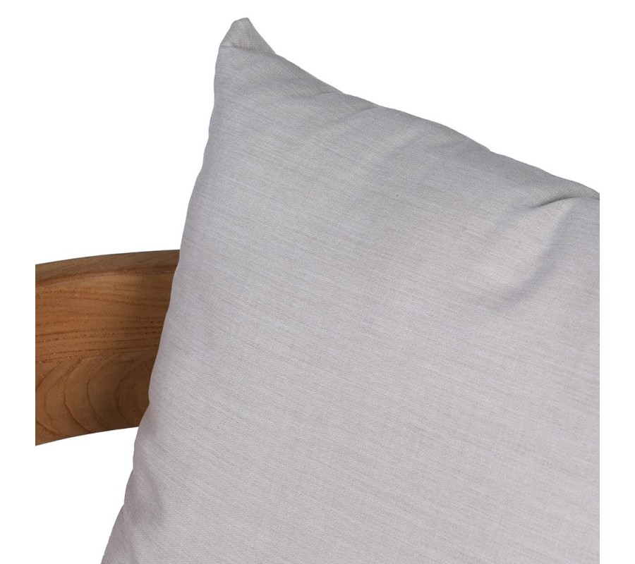 Na sedadle je umiestnený hrubý vankúš kopírujúci jeho tvar a dopĺňa ho obdĺžnikový opierkový vankúš. Penová výplň a textilný poťah sú prijemné na dotyk a zároveň prispôsobené na využitie v exteriéri. Ich elegantnú sivú farbu krásne dopĺňa bohatý teplý hnedý odtieň teakového dreva. Tento materiál má prirodzene vysoký obsah olejov, ktoré ho chránia pred vlhkosťou a zaručia tak výbornú odolnosť nábytku.