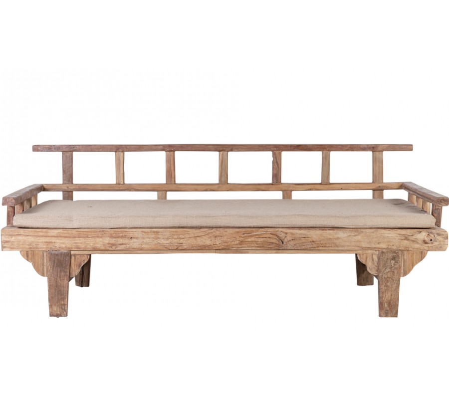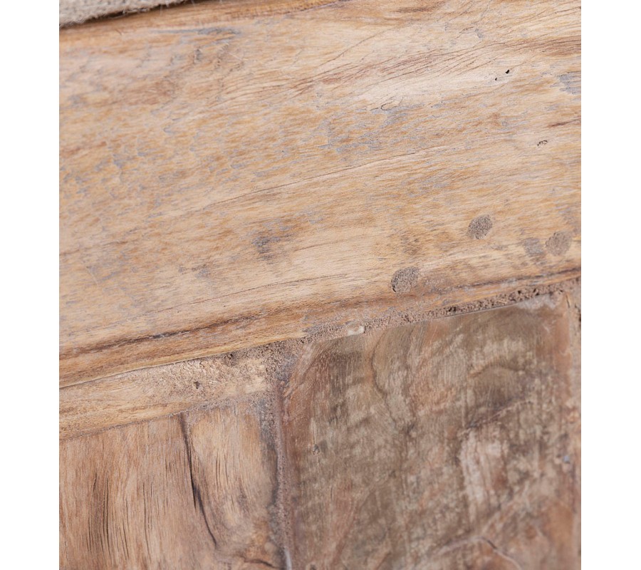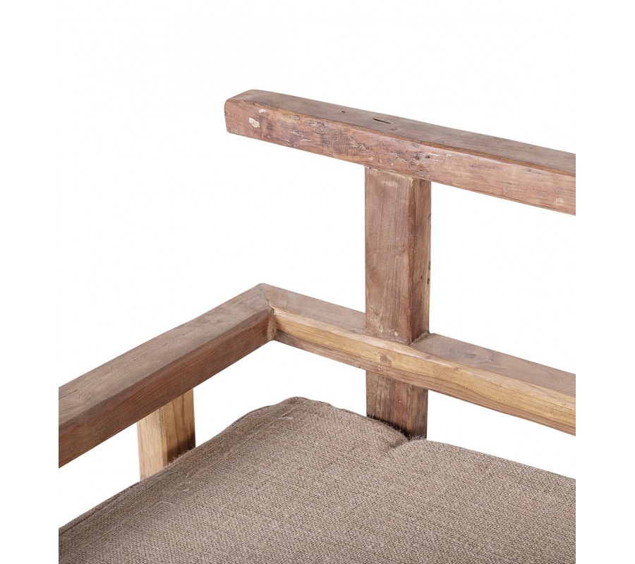 Luxusná exteriérová lavica Natural je jedinečný kúsok do vašej záhrady. Lavica je vyhotovená v etno štýle s orientálnym prírodným nádychom. Lavica je vyrobená z masívneho recyklovaného teakového dreva. Dominantou lavice sú jej operky, ktoré sú zložené z drevených lát. Lavica je obdĺžnikového tvaru s masívnym sedadlom doplneným o sivý čalúnený podsedák. Nosná konštrukcia lavice je tvorená zo štyroch hranolových nožičiek, ktoré majú pripevnené nosné podstavce s ručne vyrezanými detailmi. Nožičky sú prepojené drevenýmí spojnicamy, ktoré zabezpečujú stabilitu.