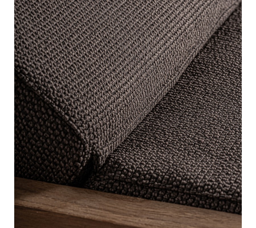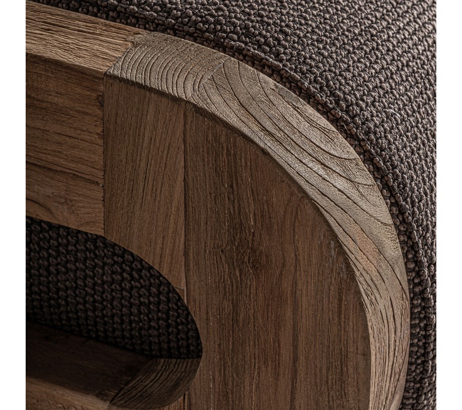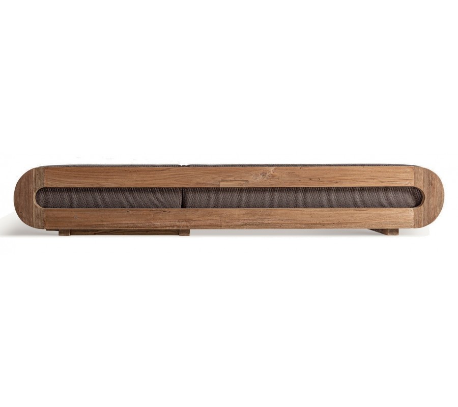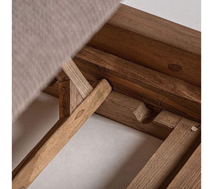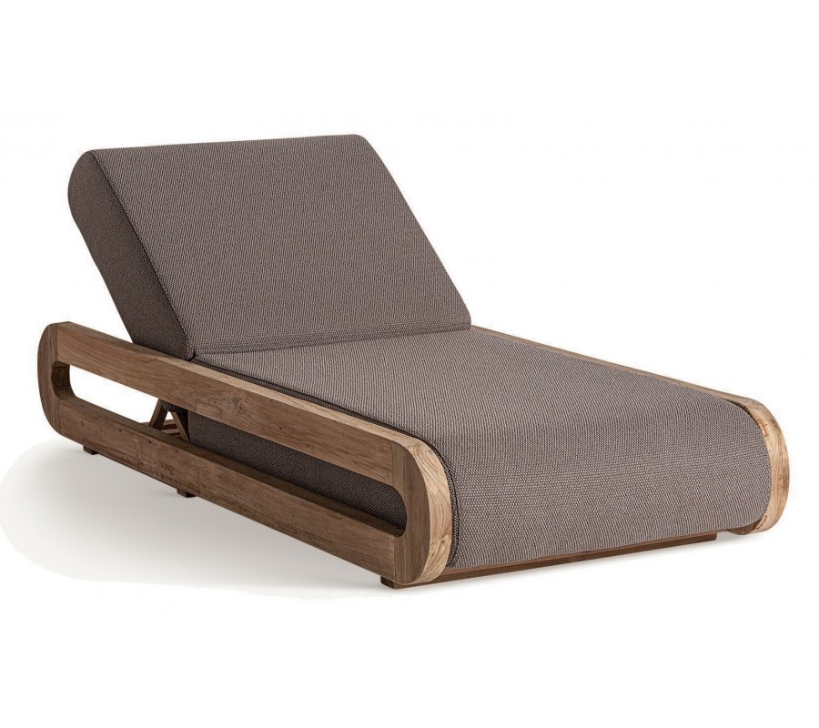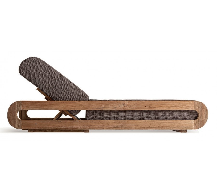 Ležacia časť je čalúnená recyklovaným poťahom z polypropylénu v prirodzenej sivo hnedej farbe, ktorá pôsobí mäkko a harmonicky s drevom. Poťah má jemne textúrovaný povrch, ktorý je zároveň príjemný na dotyk a odolný voči exteriérovým podmienkam. Nastaviteľné operadlo umožňuje pohodlné prispôsobenie podľa potreby jeho systém spočíva v jednoduchej, ale pevnej drevenej opierke, ktorá sa zasúva do jednej z niekoľkých drážok v zadnej časti vnútornej konštrukcie, čím poskytuje stabilitu a variabilitu polohovania.