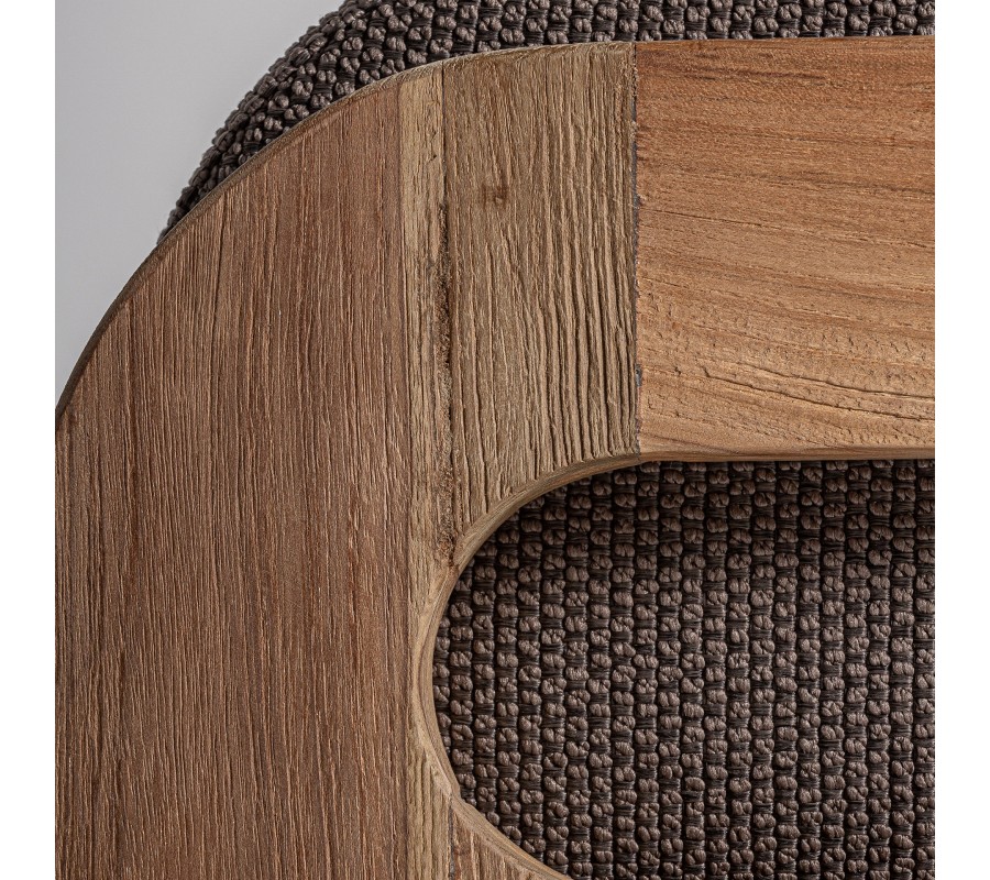 Luxusné vidiecke moderné záhradné lehátko Koras vyniká kombináciou prírodných a praktických materiálov, ktoré sú zároveň esteticky a ekologicky atraktívne. Korpus je vytvorený z naplaveného dreva s výraznou štruktúrou v teplej hnedej farbe. Po bokoch sa tiahnu masívne oválne drevené rámy, ktoré sú elegantne zaoblené a zároveň funkčne vyrezané, v ich strede sa nachádza horizontálny oválny otvor, ktorý celkovému dizajnu dodáva ľahkosť a vizuálnu priedušnosť.