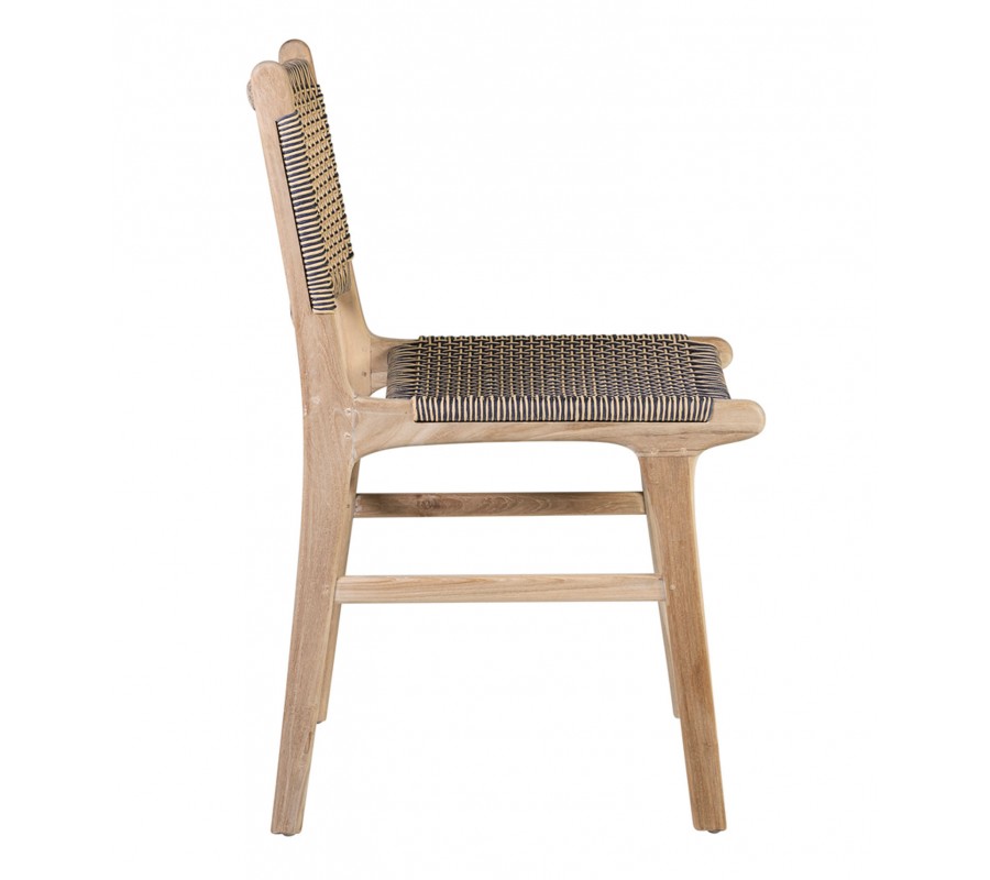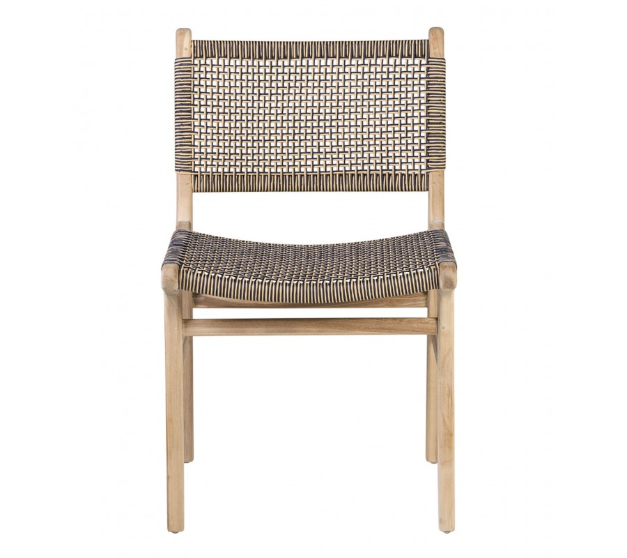 Rám stoličky je vyrobený z teakového dreva v svetlej hnedej farbe. Tento materiál je pri výrobe záhradného nábytku veľmi populárny. Drevo je pevné, flexibilné a čo je pri exteriérovom nábytku dôležité - výborne odoláva vlhkosti. Rám má jednoduchý a lineárny tvar. Zadné nožičky plynule prechádzajú do chrbtovej opierky a sú mierne zakrivené. Predné nožičky sú tiež zošikmené. Po stranách sú nožičky prepojené rovnou spojnicou, ktorá sa na bočných stranách nachádza nižšie a na prednej a zadnej strane vyššie. Zaručuje dobrú stabilitu nábytku a zároveň pridáva zaujímavý vizuálny prvok.
