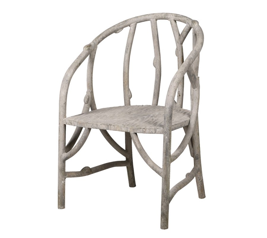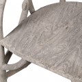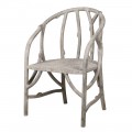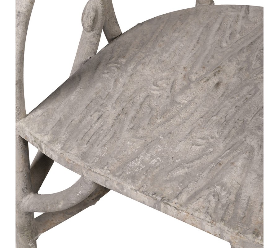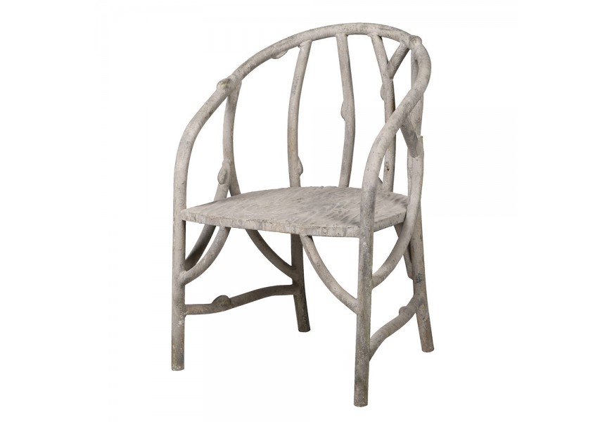 Záhradná stolička je vyrobená z kovu s povrchovou úpravou, ktorá imituje prirodzený vzhľad dreva. Farba je svetlosivá s patinovaným efektom, čo jej dodáva rustikálny a prirodzený charakter. Konštrukcia je pevná a prepracovaná, s prepletanými líniami pripomínajúcimi vetvy, ktoré tvoria jej operadlo aj rám.
