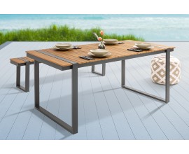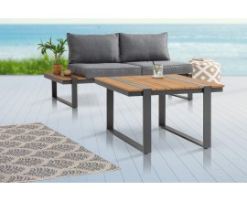 Industriálny dizajnový záhradný stolík Acostado štvorcového tvaru z dreva hnedej farby so sivými kovovými nohami 80cm