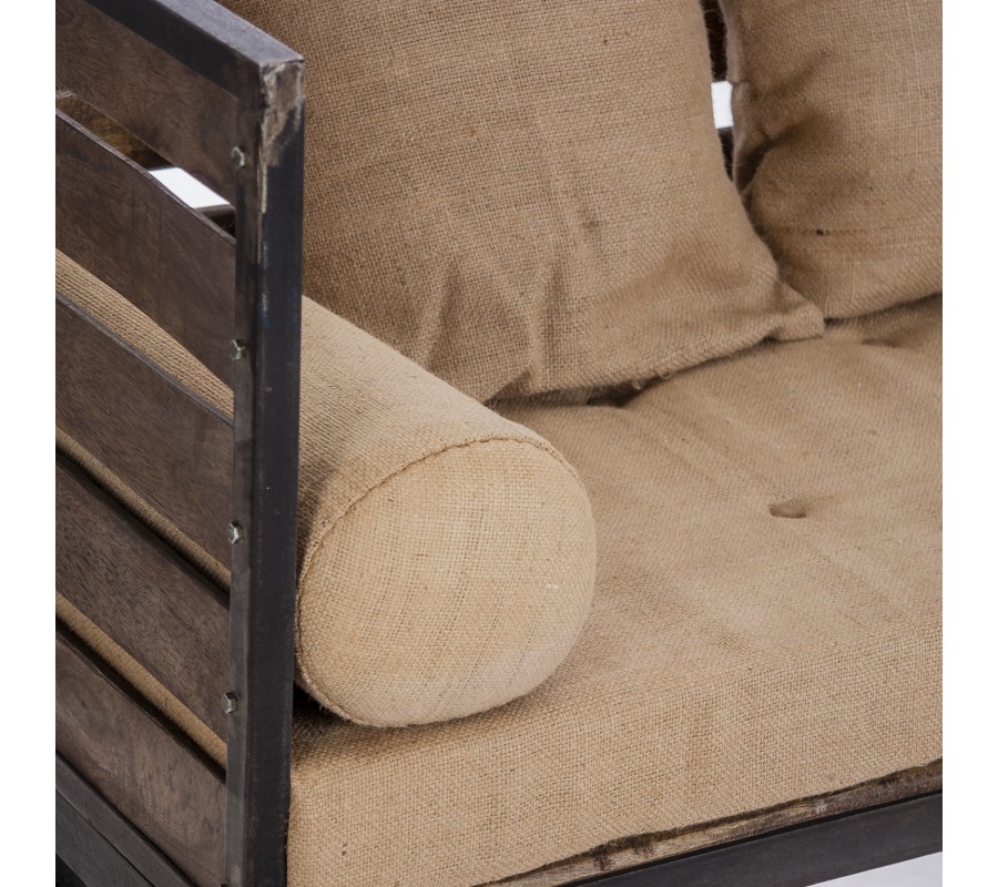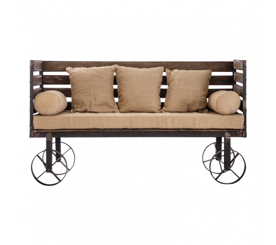 Nevšedne riešená sedačka obložená drevom na kovovej konštrukcií s markantnými kolieskami, ktoré jej dodávajú industiálny vzhľad. Čalúnenie, vrátane vankúšov a opierok, je potiahnuté jutovinou v jej nezameniteľnej béžovej farbe.