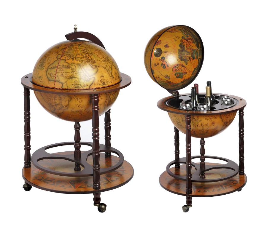 Drevený otvárací glóbus bar na kolieskach s odkladacou plochou v spodnej časti je obľúbená dekorácia obývačiek a kancelárií.