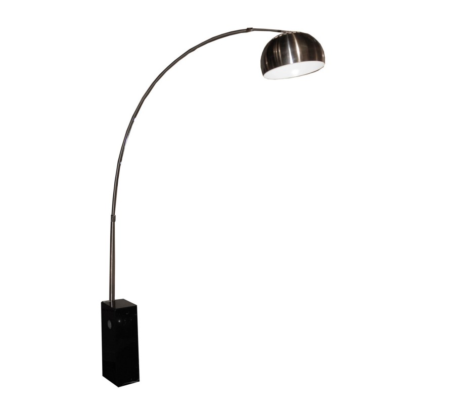 Stojaca lampa s mramorovým podstavcom čiernej farby a chrómovaného kovu.