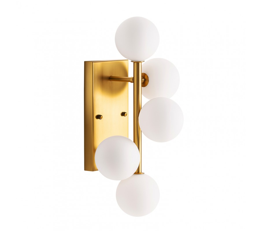 Art-deco nástenná lampa Esme s kovovou konštrukciou zlatej farby v art-deco štýle s piatimi bielymi tienidlami 48cm