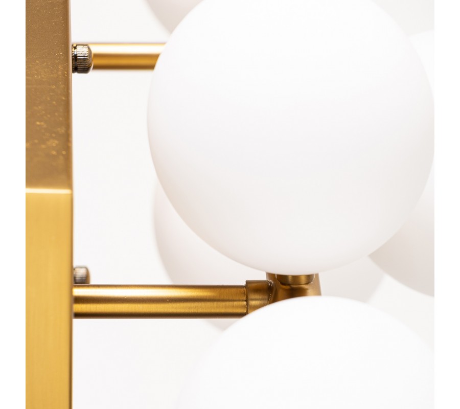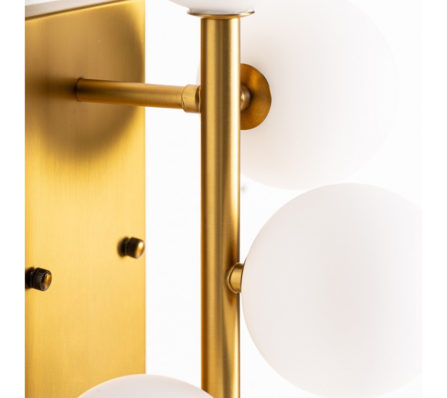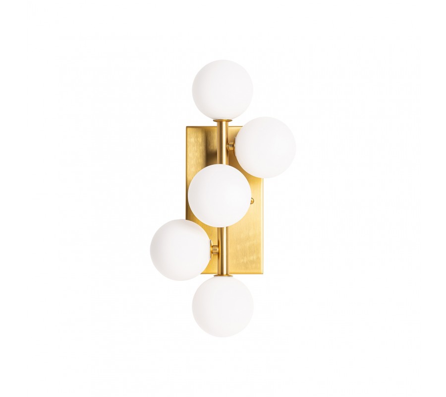 Dizajnová nástenná lampa Esme vynikne predovšetkým v art-deco ladených interiéroch. Toto nadčasové svietidlo v art-deco štýle pozostáva zo zlatej kovovej konštrukcie, na ktorej je umiestnených päť žiaroviek s bielymi sklenenými tienidlami. Vzniká tak elegantná farebná a materiálová kombinácia, ktorá vkusne spestrí moderné priestory obývačiek, pracovní či vstupných hál. Lampu Esme možno využiť aj pri zariaďovaní dizajnových hotelov či reštaurácií. Pri umiestnení na tmavú stenu sa zvýrazní art-deco nádych, ktorý možno ešte umocniť kombináciou so skleneným alebo kovovým nábytkom, sedačkou či kreslom so zamatovým čalúnením alebo kobercom s dlhým vlasom.