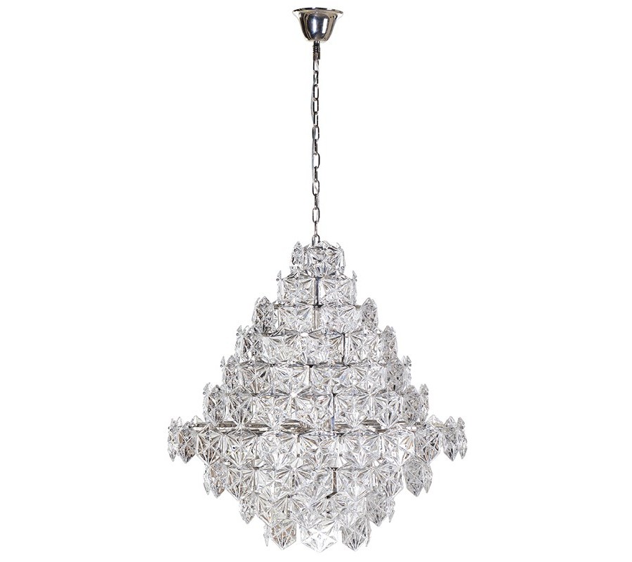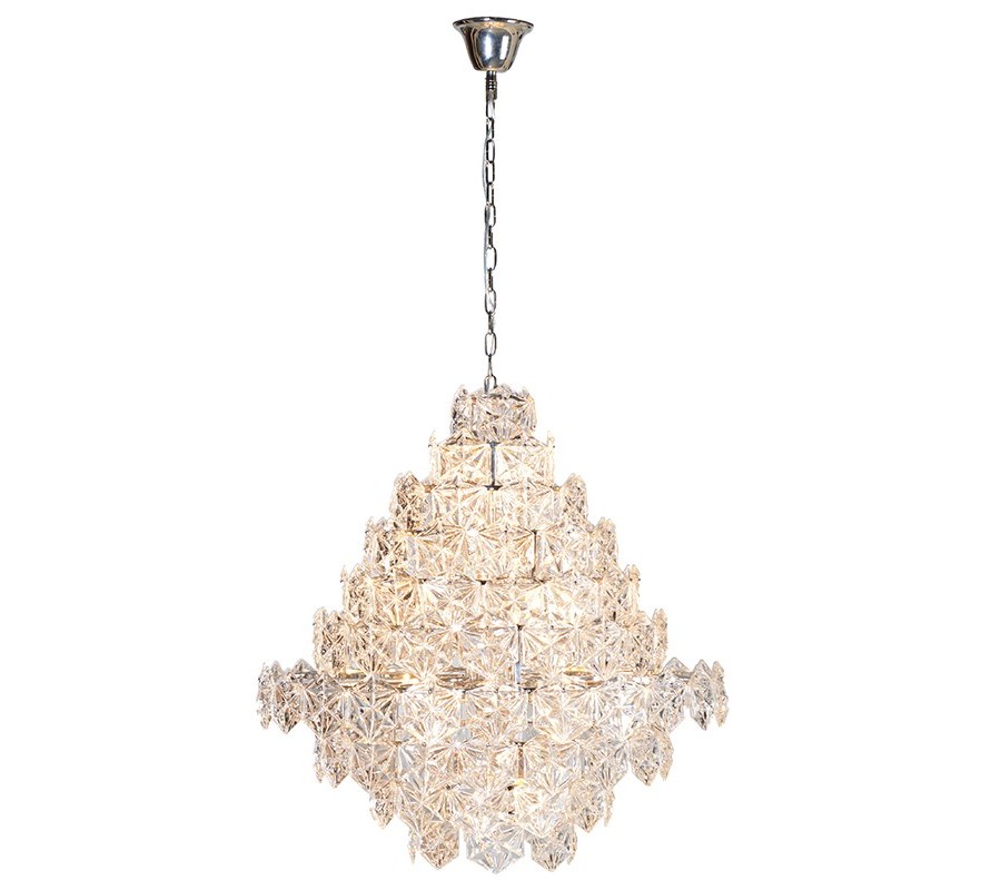 Veľký luxusný luster Eglantine je zložený z viacerých kryštálových vrstiev a kovovej reťaze. Určite sa dá zakomponovať do interiérov zladených v zámockom, art-deco štýle. Konštrukcia je v striebornej farbe. Ozdobné prvky sú v tvare smaragdov. Vhodnou kombináciou by bol masívny drevený nábytok v tmavohnedom prevedení, okrajovo kľudne kombinácia v rustikálnom štýle. Dĺžka kovovej reťaze je 150 cm. Reťaz sa dá výškovo upravovať. Možným doplnkom by boli sedacie súpravy z kože a zdobením v podobe cvokov, ktoré vytvoria historickú, zámockú atmosféru. Celkovým dojmom luster pôsobí elegantne a rozžiari Váš interiér.