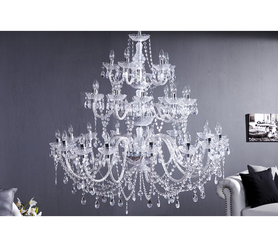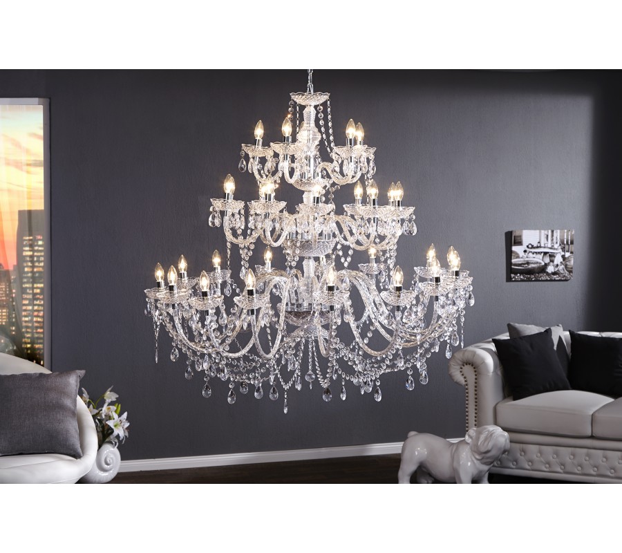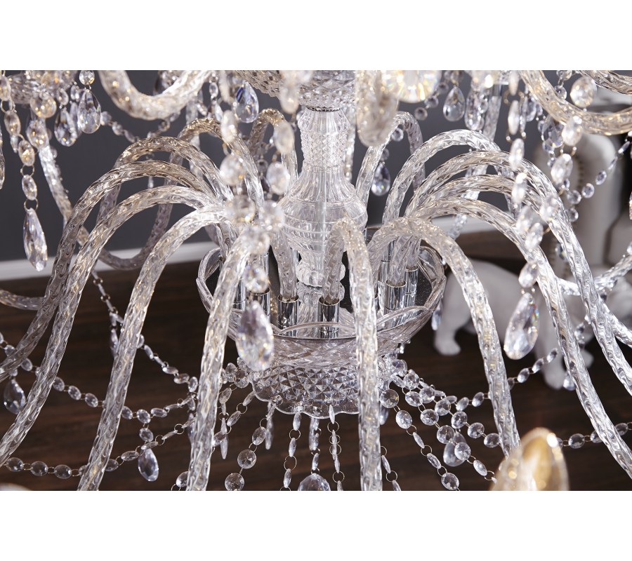 Dominantnú stredovú os lustra tvorí viacnásobne členený dekoratívny stĺp, ktorý nesie celé osvetlenie a zároveň slúži ako estetický stredobod. Z neho vychádzajú prepojené ramená s päticami E14 pre žiarovky s výkonom do 25 W, čím sa zabezpečuje rovnomerné a intenzívne osvetlenie aj veľkých miestností. Celkovo až 30 svetelných bodov vytvára fascinujúcu svetelnú kompozíciu, ktorú ešte umocňuje lom svetla na jednotlivých akrylových kryštáloch.