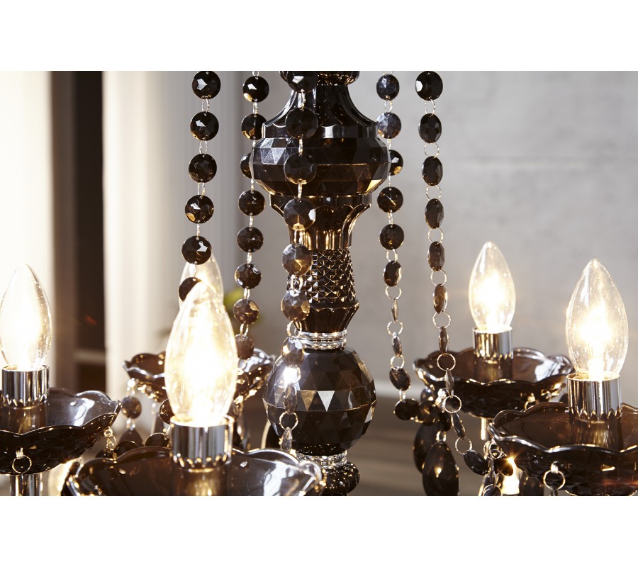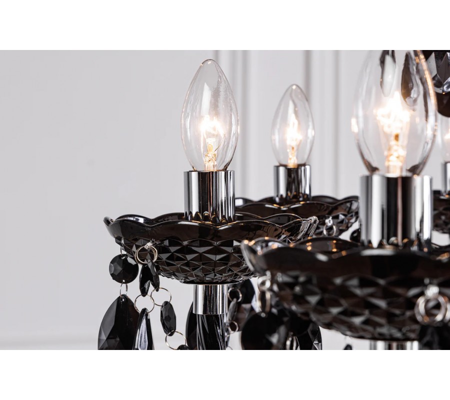 Osvetlenie je riešené pomocou žiaroviek v tvare klasických sviečok, ktoré sú umiestnené na zdobených miskovitých podstavcoch. Tieto podstavce sú tvarované do podoby ozdobných kalichov s plastickým povrchom, ktorý pripomína brúsené sklo. Kovové objímky žiaroviek kontrastujú s čiernym lesklým akrylom a dodávajú lustru moderný lesk.