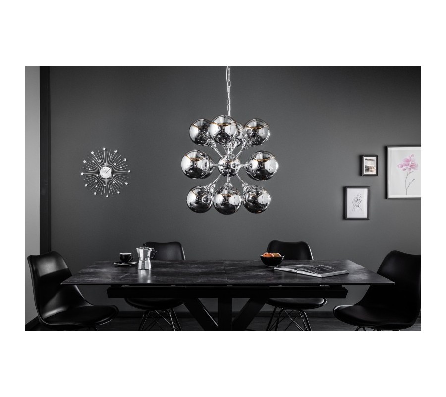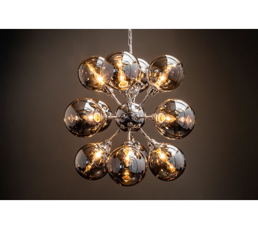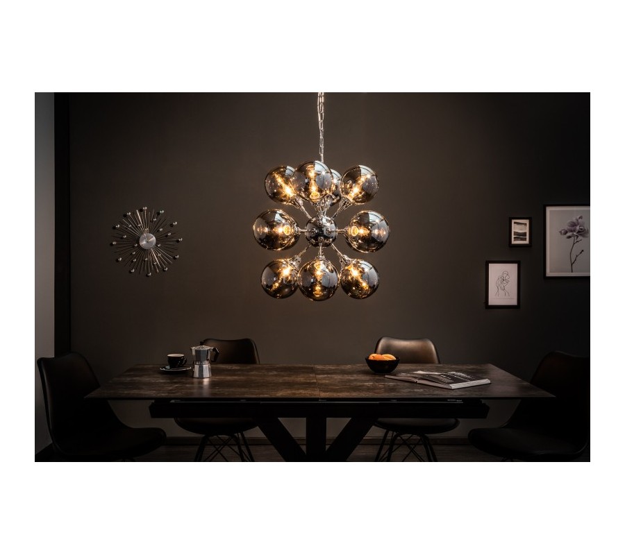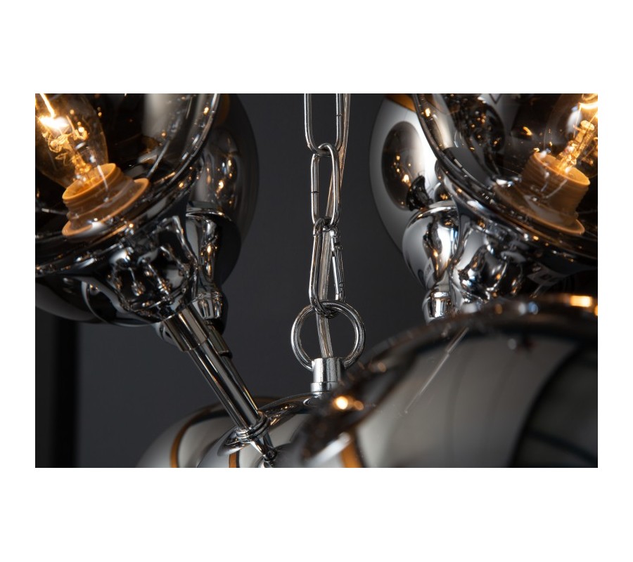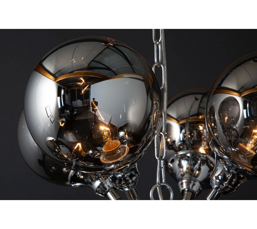 Tento závesný luster pôsobí atypicky a jedinečne vďaka svojmu dizajnovému tvaru vytvoreným za použitia sklenených gúľ s nanesenou polopriehľadnou striebornou farbou, vďaka ktorej má luster strieborný luxusný efekt pri vypnutom svetle. Naopak, luster pri zapnutom svietení pri žiarovkách s teplým svetlom pôsobí zase zlatisto, čo je možné ovplyvniť výberom teploty svetla žiaroviek. Strieborným prevedením sa hodí do kontrastne zariadených interiérov s využitím tmavých až čiernej farby, ktorá použitú striebornú farbu zvýrazní.