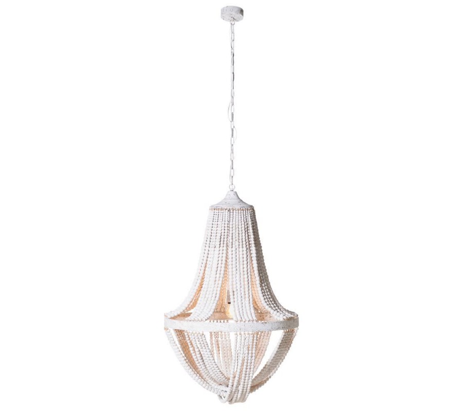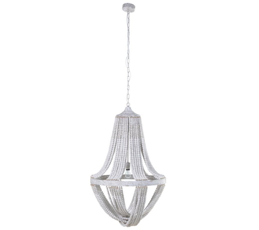 Jedinečný dizajn luxusného provensálskeho závesného svietidla Vás jednoznačne upúta už na prvý pohľad. Unikátne tienidlo závesného svietidla je tvorené množstvom reťazí tvorených z bielych korálikov z javorového dreva, ktoré sú upevnené na drevenej obruči v bielej farbe, dodávajúc tak lustru jemný éterický nádych, napriek jeho dominantným rozmerom. Svietidlo sa bude vynikajúco vynímať najmä v miestnosti s vysokým stropom a vďaka jeho jemnej krémovo-bielej farbe efektívne doplní provensálsky ladené interiéry. Celkový výška svietidla vrátane závesnej reťaze je 200cm. K svietidlu odporúčame žiarovku typu B22 s maximálnym výkonom 40W.