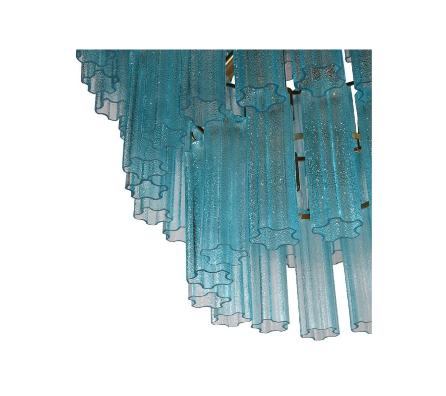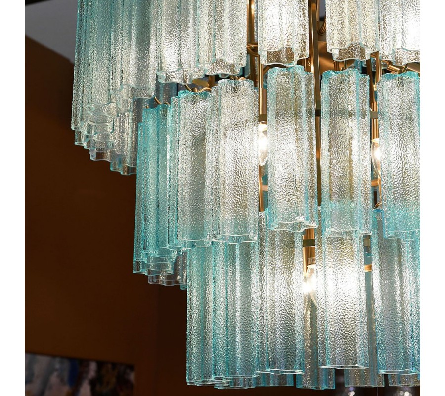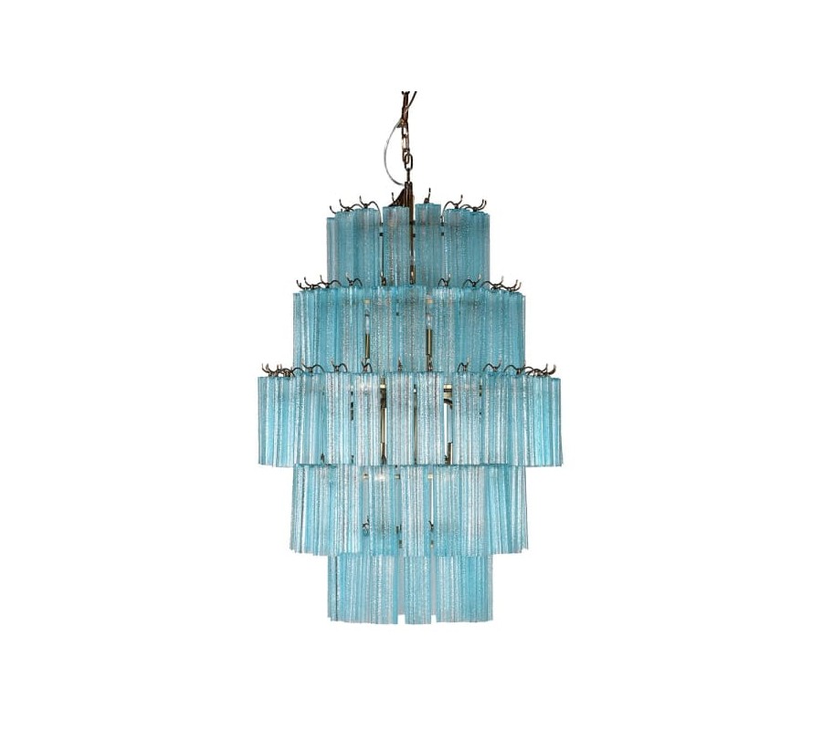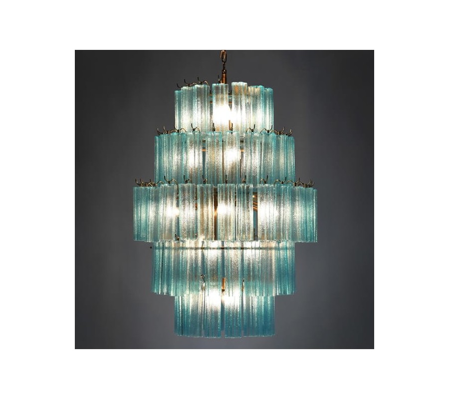 Konštrukcia lustra je vyrobená z kovu. Jej zlatá farba dodáva svietidlu luxusný nádych a metalický povrch znásobuje odrazy svetla. Tienidlo je vyrobené z farebného skla vo výraznom tyrkysovom odtieni. Na vnútornom ráme sú na každej z piatich úrovní umiestnené úchytky na žiarovky typu E14. Celkovo je potrebných 18 kusov, ktoré nie sú súčasťou balenia.