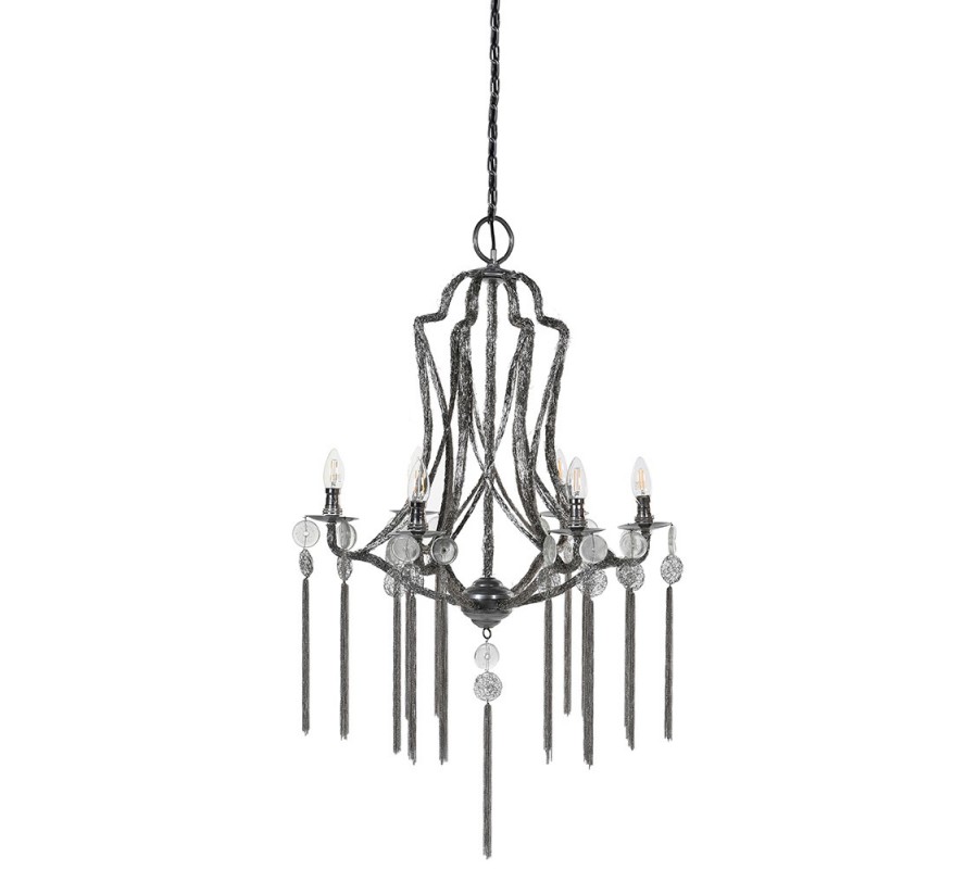 Vintage kovový strieborný závesný luster Shiny so šiestimi ramenami a ozdobnými korálkami 110cm