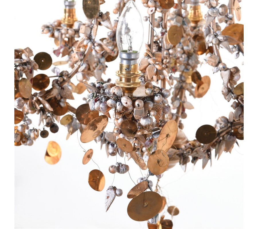 Závesné stropné svietidlo Gloria v zlatej farbe s korálkovým a mušľovým zdobením v art deco štýle so šiestimi žiarovkami 90cm