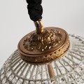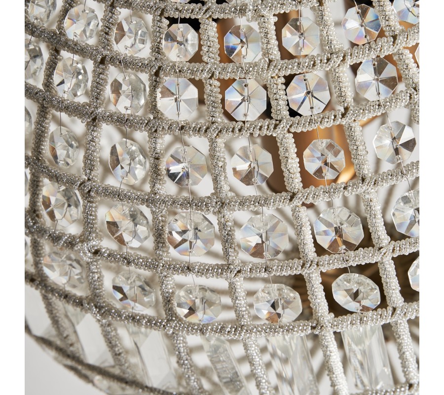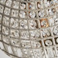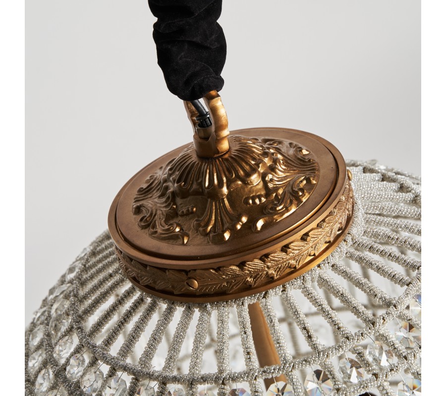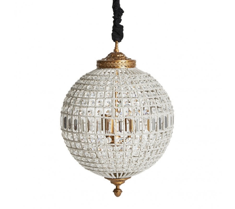 Originálny kúsok v podobe elegantného závesného lustra Laton v art deco štýle zaujme na prvý pohľad nie len umelecky ladené duše. Vysoko kvalitné vyhotovenie lustra je korunované brúsenými priehľadnými krištáľmi, ktoré sú jednotlivo uložené v štvorcovitom výplete konštrukcie. Pôvab výpletu spočíva vo veľkom množstve sklenených korálok v perleťovej farbe so schopnosťou odrážať svetlo, a tak podčiarknuť rozžiarenie vášho interiéru. Art deco luster Laton je tvorený krištáľmi podlhovastého tvaru v ekvatoriálnej rovine doplnenými mnohouholníkmi z vrchnej aj spodnej strany gule. Oba póly závesného lustra nesú mosadzné aplikácie s jemným leskom a dekorom v tvare listov a abstraktných ornamentov. Závesný luster Laton obsahuje 100cm napájací kábel, ktorý je sofistikovane maskovaný čiernym zamatovým plášťom, z ktorého sa stane štýlový doplnok každej art deco ladenej obývačky, vstupnej haly či jedálne. Dokonale vynikne v kombinácii so zamatovou art deco sedačkou v modrej či smaragdovej farbe. Závesný luster nesie tri žiarovky, typ: E27, 40w.