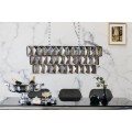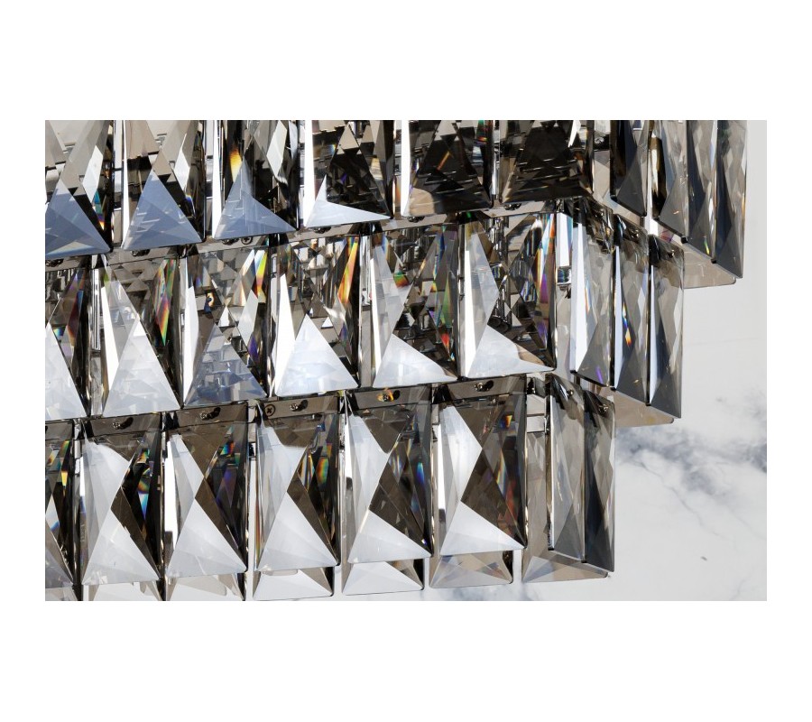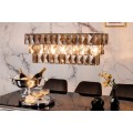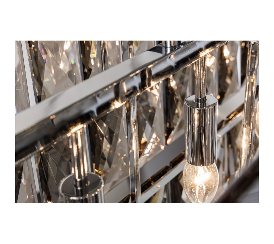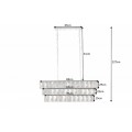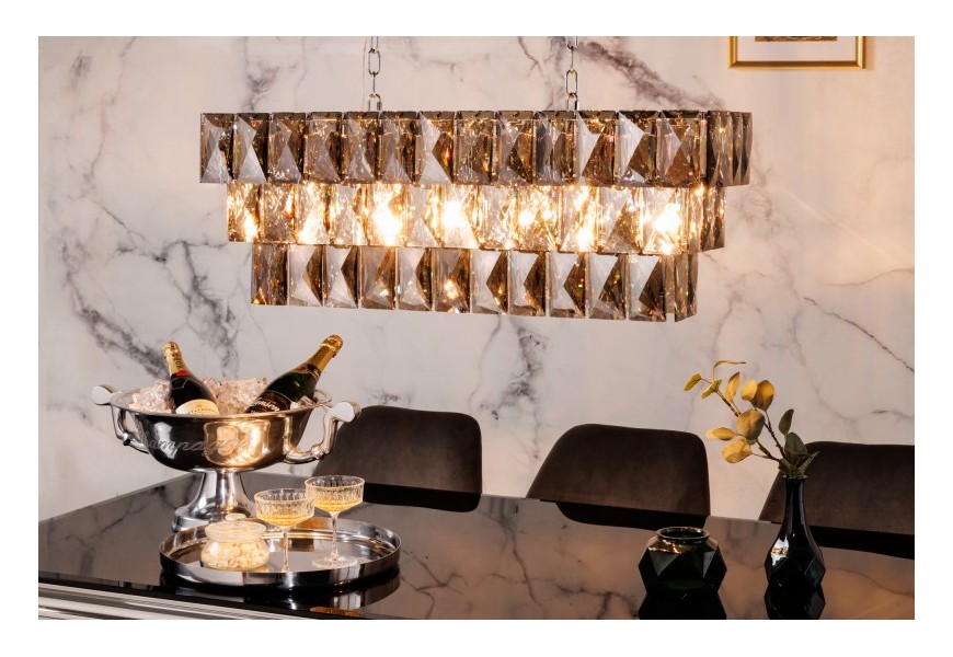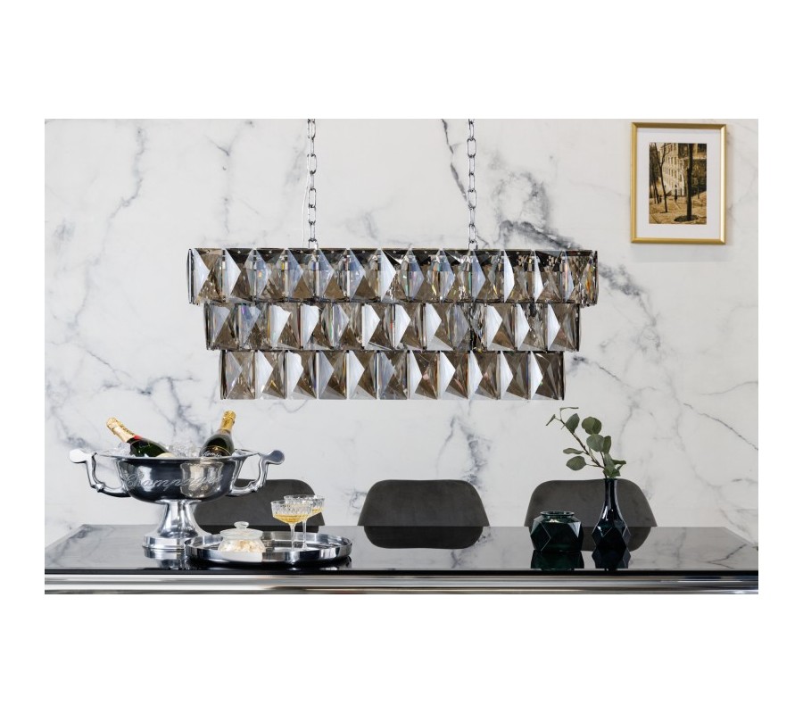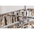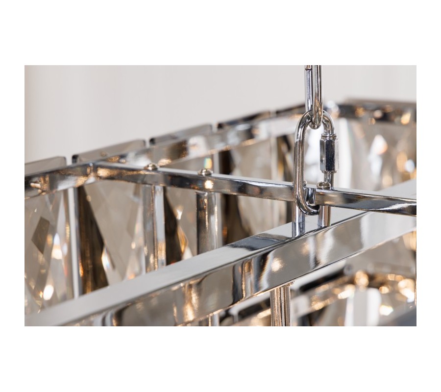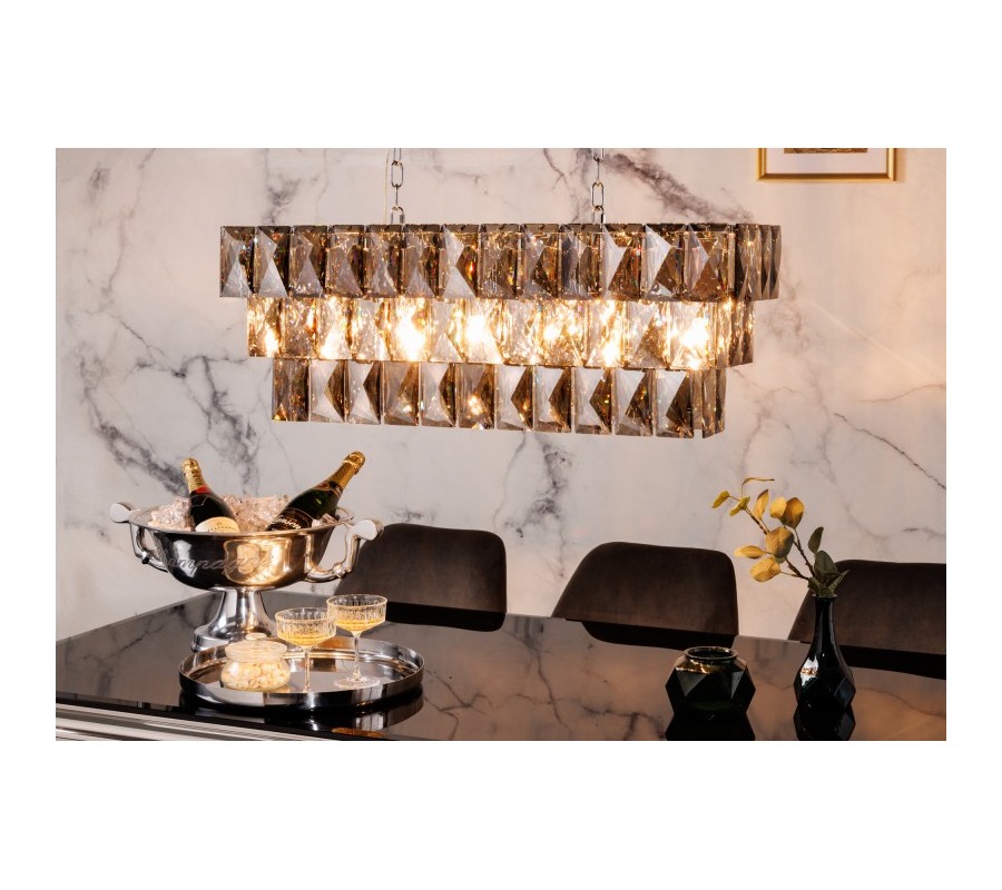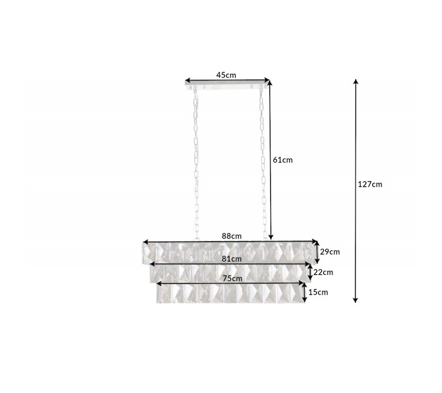 Luxusná závesná lampa Leontin je exkluzívnym kúskom, ktorý zaujme svojím vysoko elegantným vzhľadom. Jeho konštrukcia pozostáva z troch úrovní obdĺžnikového tvaru vytvárajúcich vzhľad obrátenej pyramídy. Chrómovú konštrukciu striebornej farby visiacu na kovových reťaziach dopĺňa nádherné krištáľové zdobenie, ktoré vo vašich priestoroch vytvorí honosný nádych. Vzniká tak jedinečne pôsobiaci dizajn s nádychom glamour štýlu, ktorý si uplatnenie nájde v moderných i art deco ladených luxusných interiéroch. Vďaka krištáľovému zdobeniu vzniká nádherný svetelný efekt. Závesná lampa Leontin tak výborne poslúži na rozjasnenie obývačiek či jedální, no svoje miesto si nájde aj vo firemných, hotelových či iných reprezentatívnych priestoroch. Závesná lampa Leontin vynikne v kombinácii s výrazným tmavým stolom z kovu či skla, sedačkami s koženým alebo zamatovým čalúnením a bohatými doplnkami vo výrazných farbách. Vhodné sú tiež zlaté alebo strieborné doplnky, rovnako ako aj dekorácie so zrkadlovým efektom či luxusné koberčeky s dlhým vlasom. Do lampy je potrebných 5 kusov žiaroviek typu E14 max 40W.