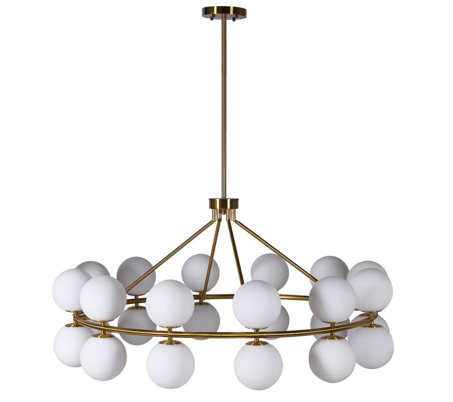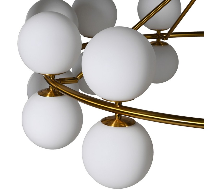 Luxusný luster Linis v art-deco štýle predstavuje vrchol dizajnového umenia a sofistikovanosti. Jeho glamour vzhľad sa nesie v duchu art-deco tradície, ktorá je známa svojimi geometrickými tvarmi, bohatými materiálmi a výraznou estetikou. Luster sa skladá z 24 svetelných zdrojov, umiestnených paralelne na dvoch úrovniach na kruhových obručiach. Tento dizajn vytvára dynamický vizuálny efekt a poskytuje bohaté osvetlenie. Kovová konštrukcia v zlatej farbe je doplnená luxusnými bielymi sklenenými guľami. Táto kombinácia nie lenže zvyšuje estetický apel svietidla, ale zároveň mu dodáva pocit skutočnej opulencie. Luxusný luster Linis je perfektným vyjadrením glamúru a elegancie. Stáva sa dominantným centrálnym prvkom v akomkoľvek priestore, ako napríklad veľkolepá obývacia izba, jedáleň alebo priestranná vstupná hala. Jeho výrazný a sofistikovaný art deco štýl pridáva priestoru pocit luxusu a historického šarmu. Do svietidla sú potrebné žiarovky s objímkou G9.