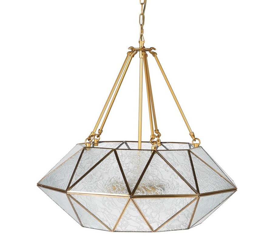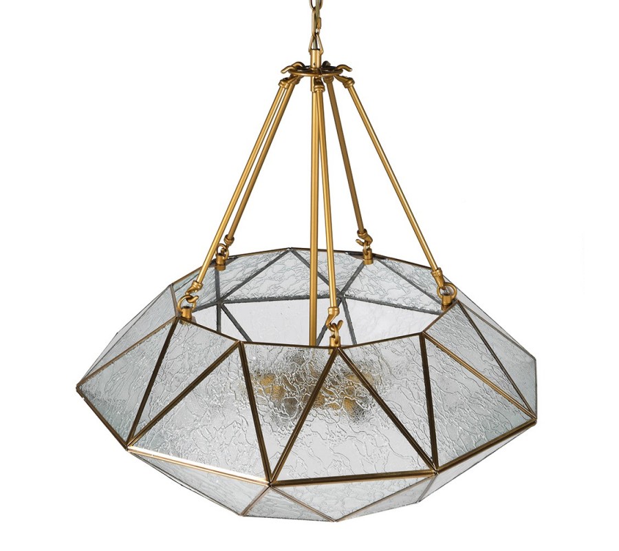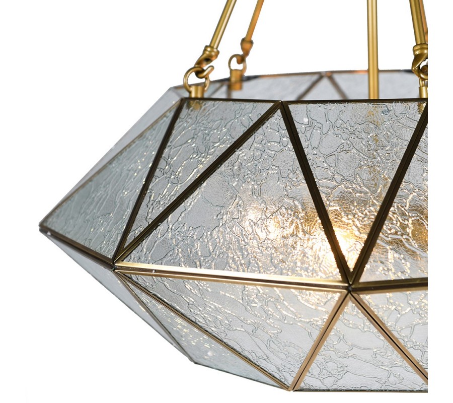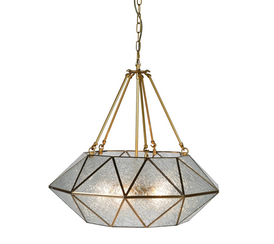 Doplňte si svoje art deco ladené priestory štýlovým svietidlom Erin, ktorá k vám vnesie ndáych elegancie a luxusu! Svietidlo tvorí konštrukcia z kovu geometrických tvarov, ktorá vytvára vzhľad diamantu. Nesie sa v zlatej farbe a vypĺňajú ju jednodlivé trojuholníkové sklíčka s jemným vzorom. Vzniká tak polopriehľadná konštrukcia slúžiaca ako tienidlo, ktorá príjemne stlmí svetlo a zároveň vaše priestory esteticky doplní. Závesná lampa Erin dokonale vynikne v obývačke či jedálni ladenej v art deco štýle nad konferenčným či jedálenským stolom. Pre umocnenie art deco vzhľadu odporúčame tiež kombináciu s výraznými zamatovými sedačkami či kreslami a nábytkom z kovu a skla. Vhodné sú tiež kúsky so zlatými akcentami s nádychom glamour. Do lampy sú vhodné žiarovky typu E27 max 60W. Dodávame bez žiaroviek.