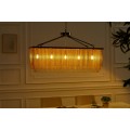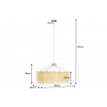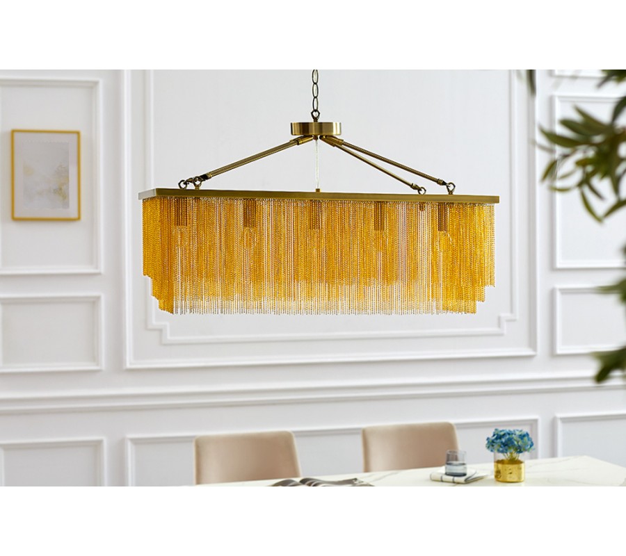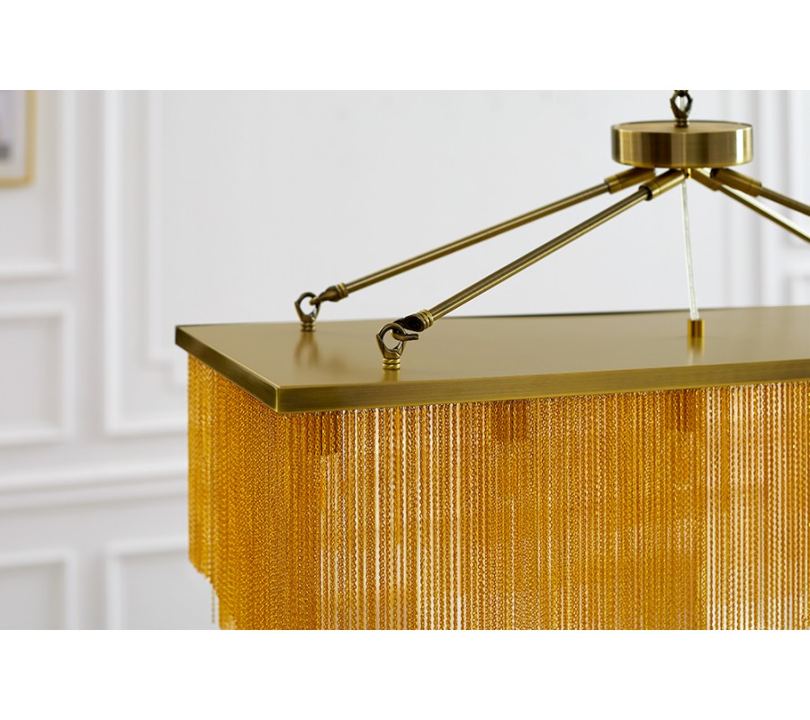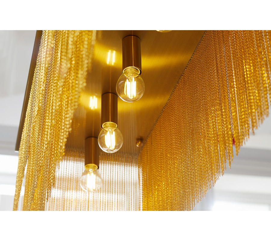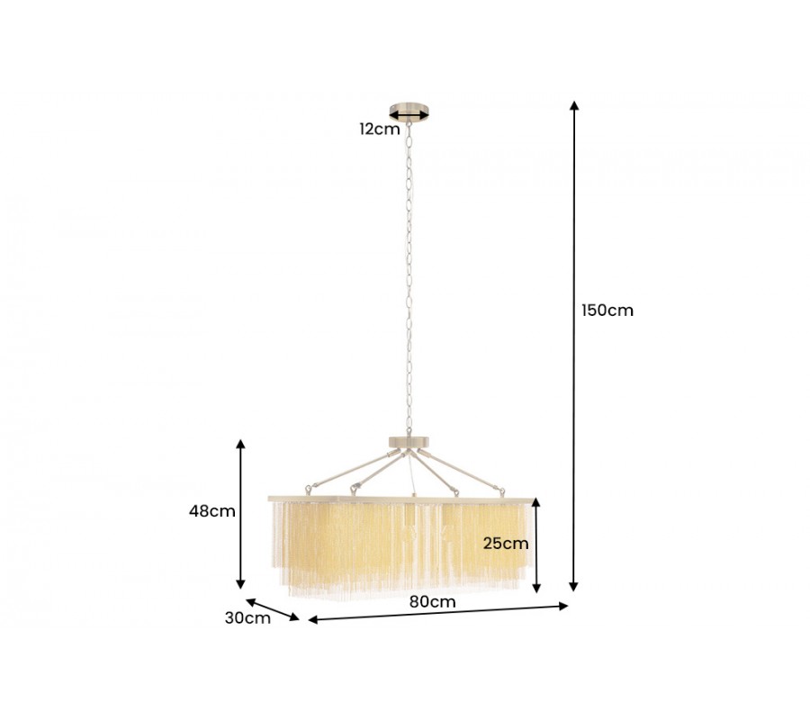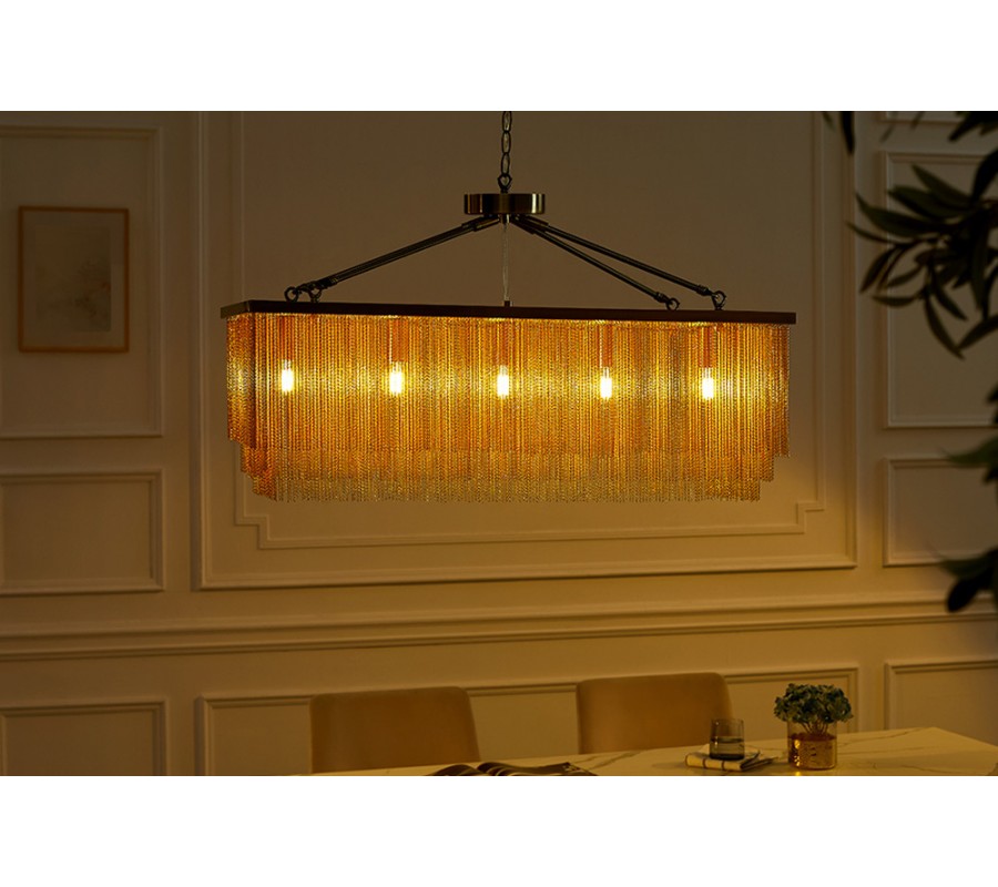 Je zavesený na kovovej reťazi, cez ktorú vedie prívodný kábel s dĺžkou 100 cm. Reťaz sa napája na okrúhly disk so štyrmi závesnými ramenami, držiacimi obdĺžnikový plát. Na ňom sa nacgádza päť objímok na žiarovky typu E27 s maximálnym príkonom 60 wattov, ktoré nie sú súčasťou balenia. Konštrukcia je vyrobená z kovu a má zlatú farbu, ktorá fantasticky dopĺňa sýtejší, žlto zlatý odtieň tienidla.